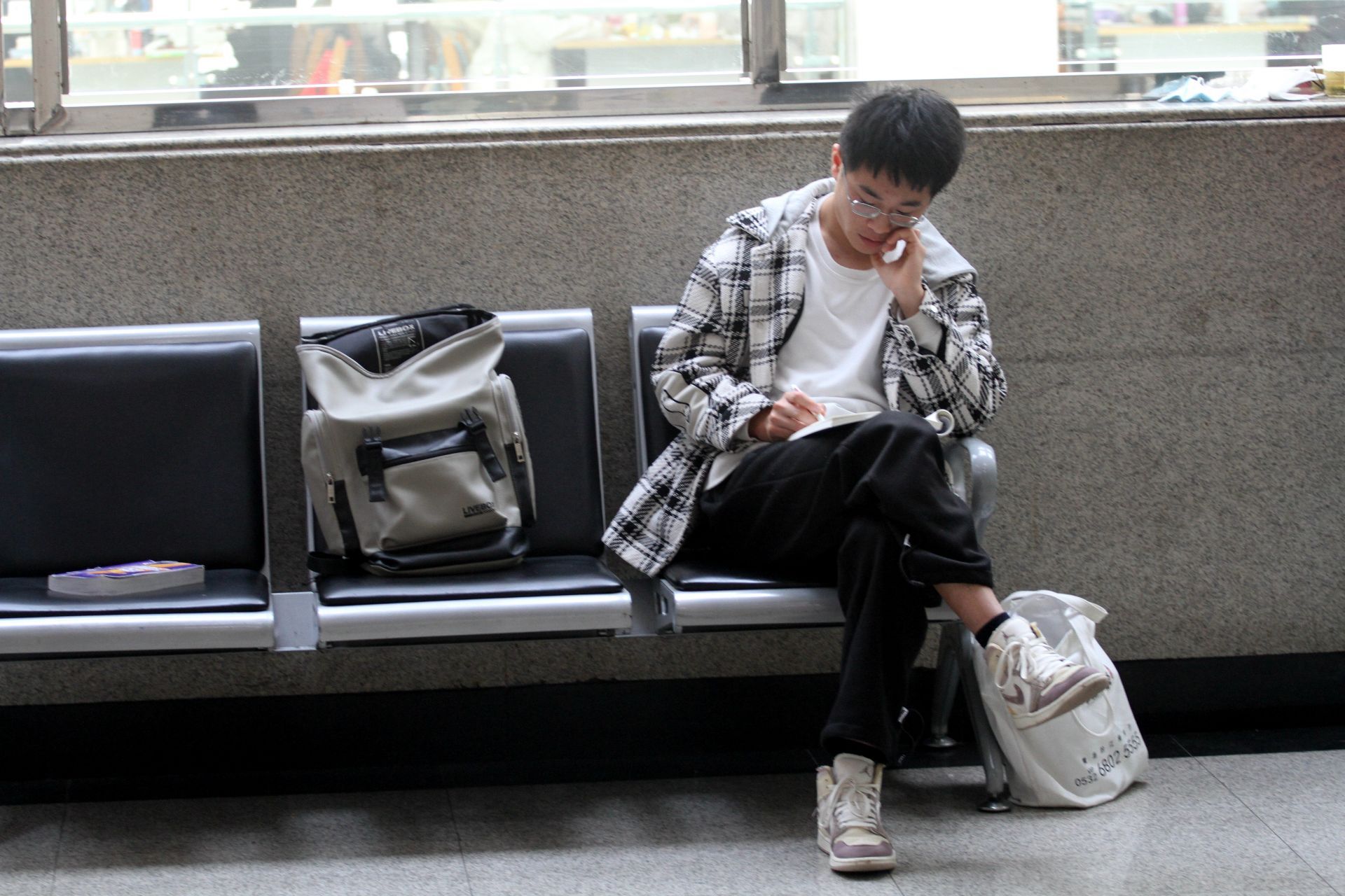 窗台边读书的年轻人。