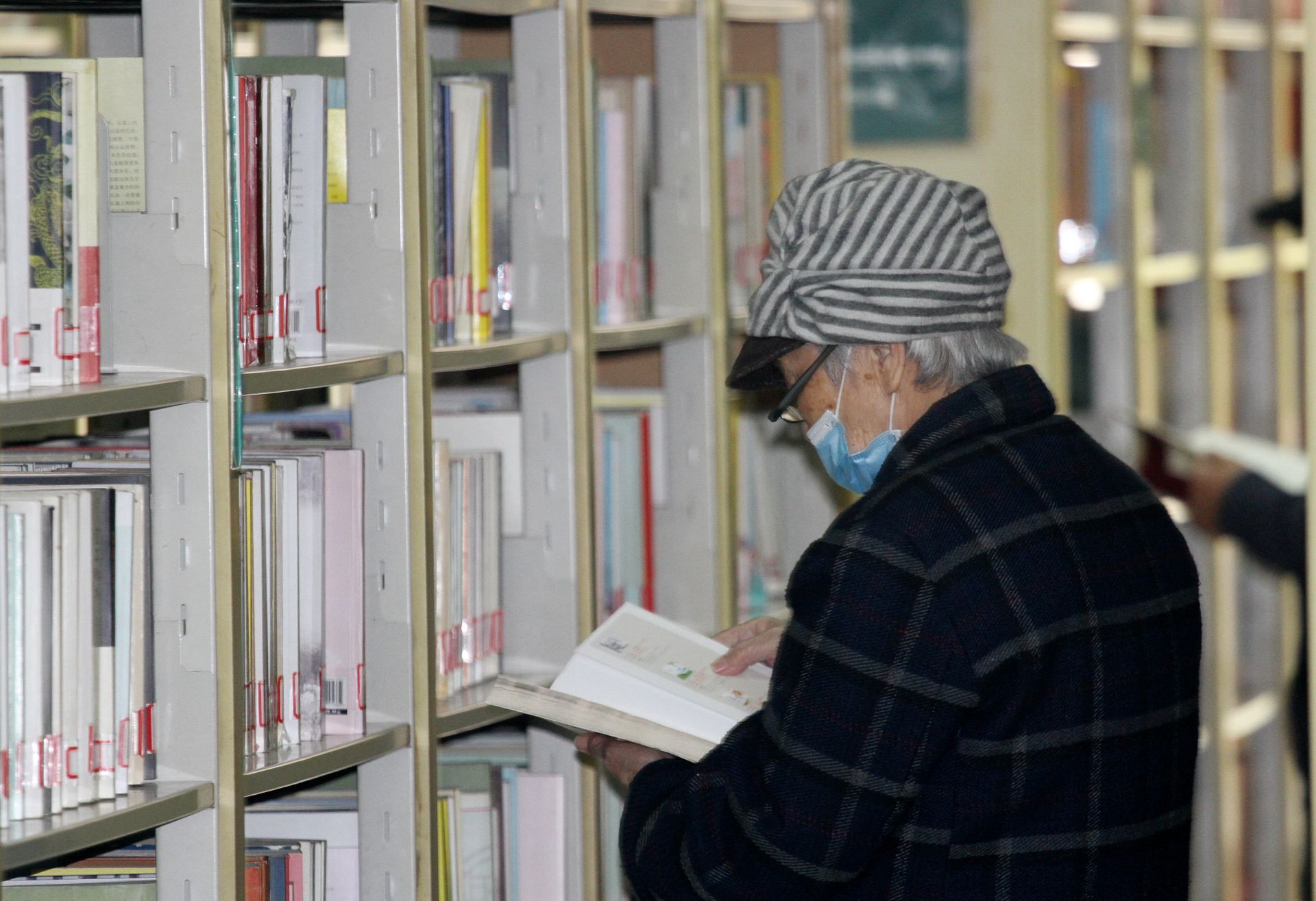 图书馆内一白发老者正在读书。