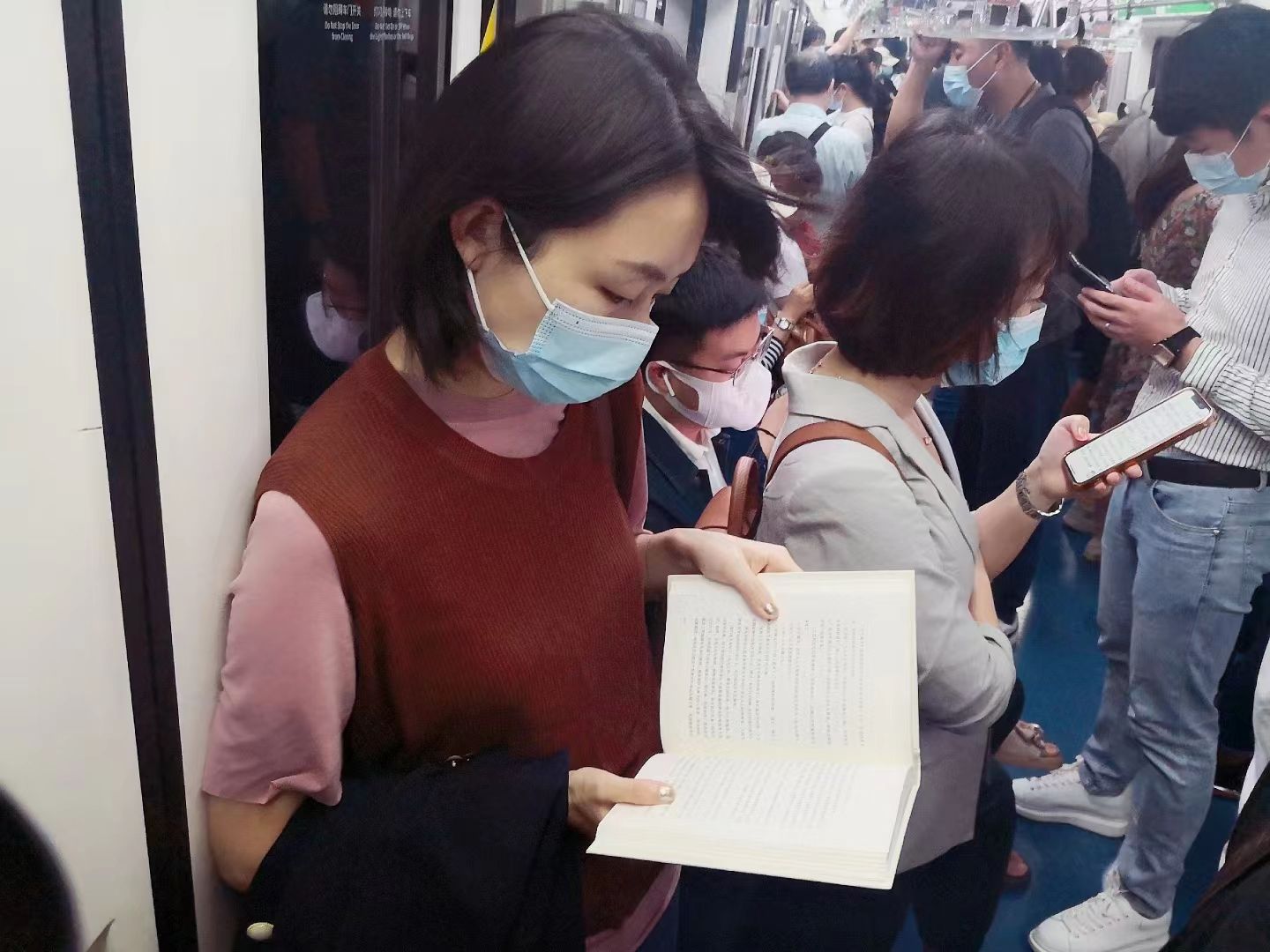 地铁上正在阅读的女士。