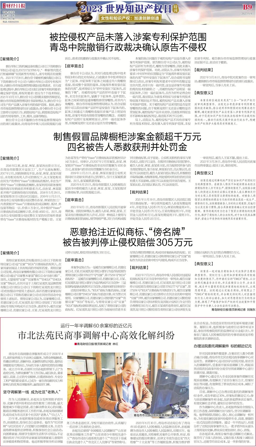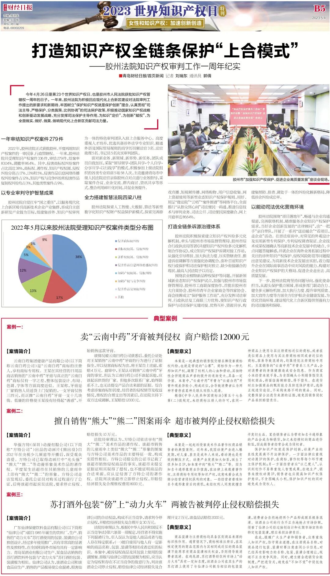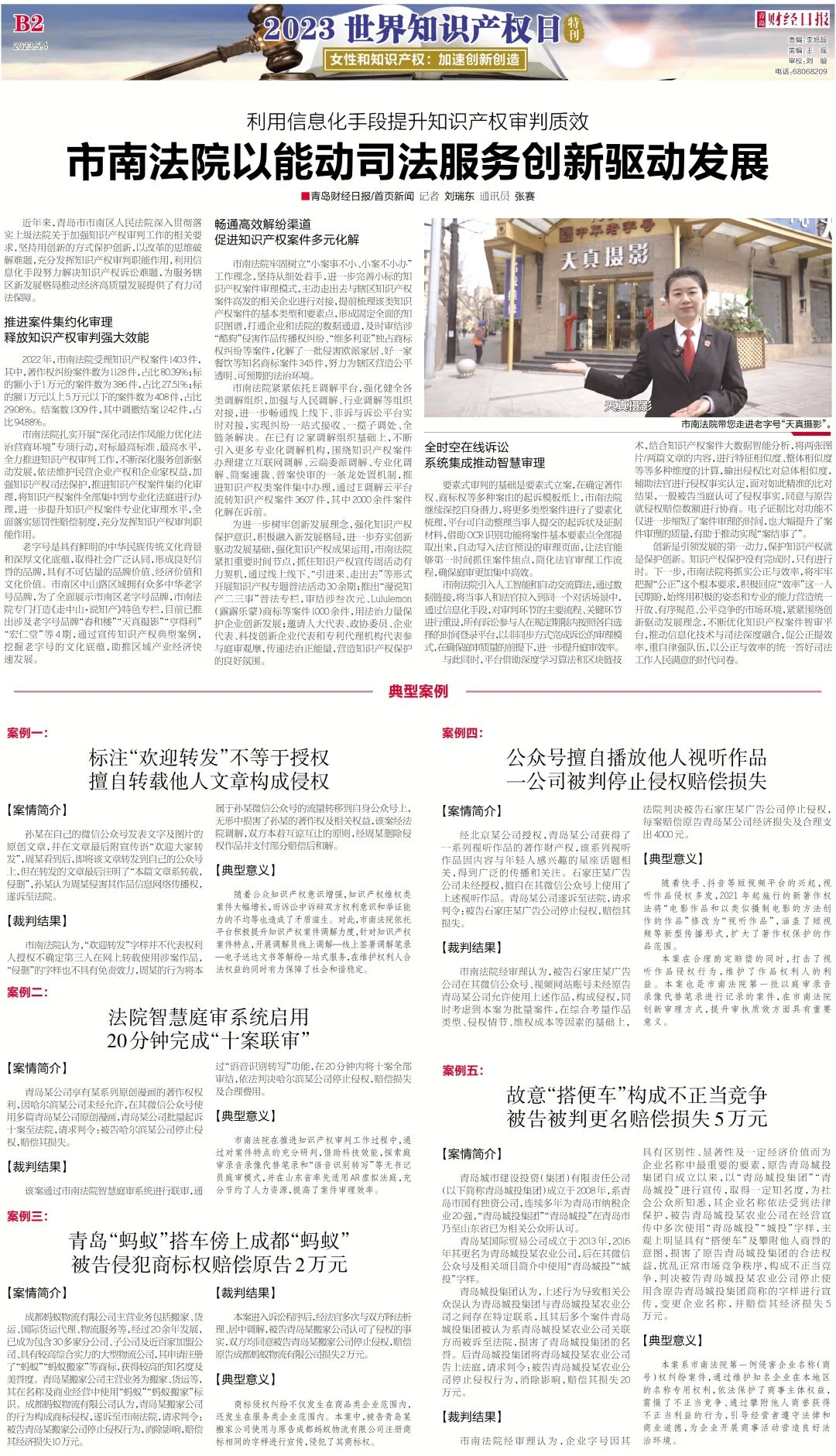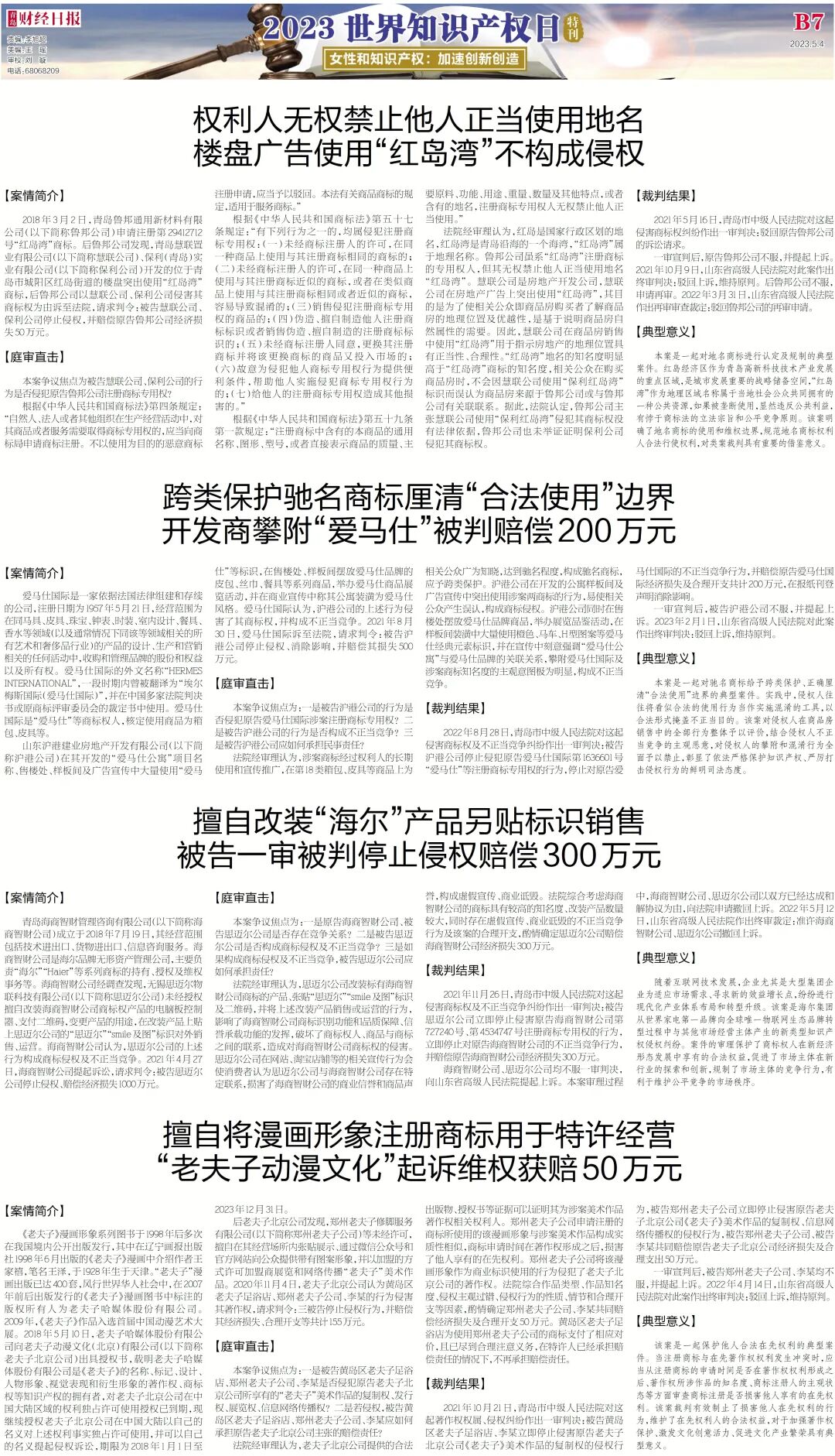 据悉,《青岛财经日报》与青岛市中级人民法院、青岛知识产权法庭自2006年起已连续18年在每年的4月26日前后推出《世界知识产权日特刊》,营造支持创新保护创造的良好社会氛围。