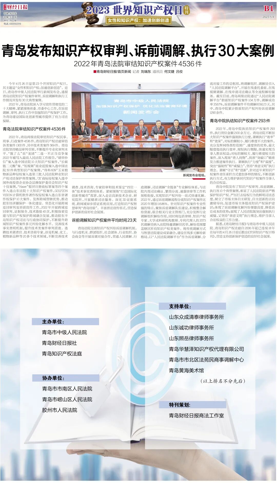 今年4月26日是第23个世界知识产权日,其主题是“女性和知识产权:加速创新创造”。近日,青岛市中级人民法院举行新闻发布会,通报青岛法院知识产权案件审判、诉前调解和执行工作情况并发布30大典型案例。