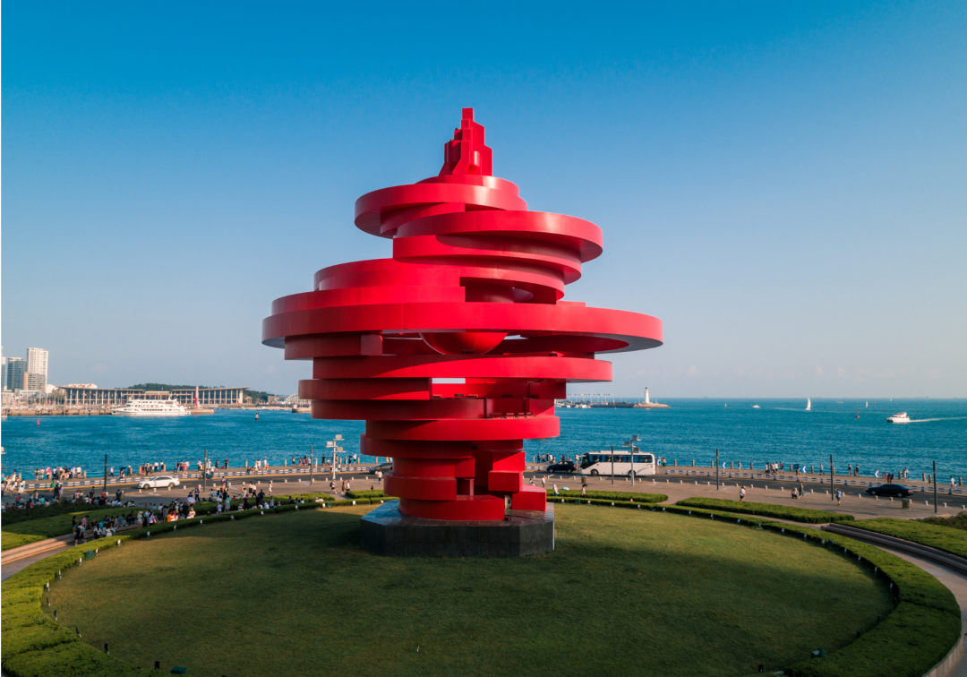 这座大型钢结构雕塑通体火红,直径27米,高约30米,重达500余吨。它以单纯简练的造型元素排列组合成旋转腾空的“风”,顶部装置火炬头,寓意青岛与五四运动的渊源。升腾而起的风旋,昭示着新中国青年昂扬向上,昭示着青岛人民继往开来。