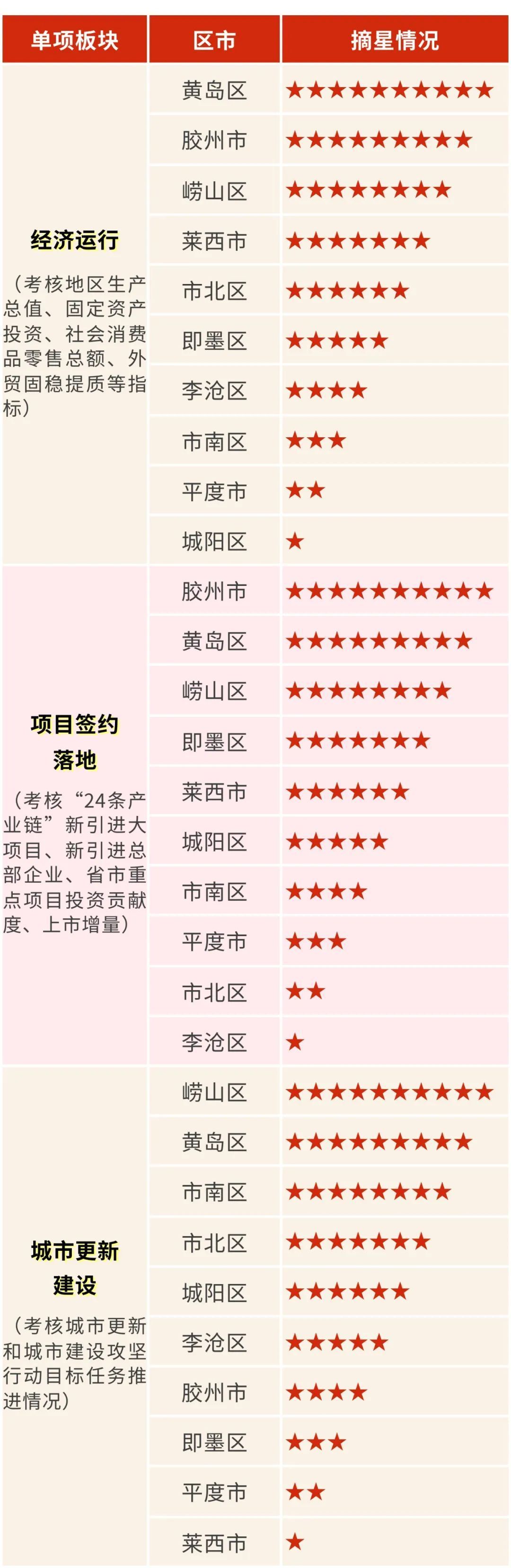 对经济运行、项目签约落地、城市更新建设3个板块,按“10星”至“1星”逐级评星。同时,对市南区、市北区在省旅发大会和历史城区保护更新工作中的积极贡献予以表扬。具体情况如下: