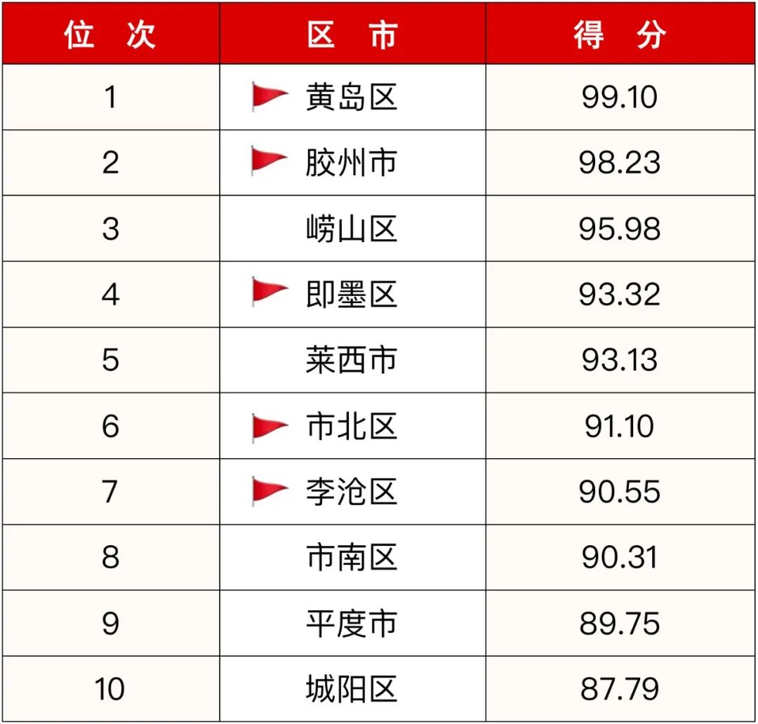 根据考核办法规定,黄岛区、胶州市综合成绩居前2位,夺得“真抓实干、勇当排头”红旗;即墨区、市北区、李沧区提升2个及以上位次,夺得“加压奋进、进位赶超”红旗。