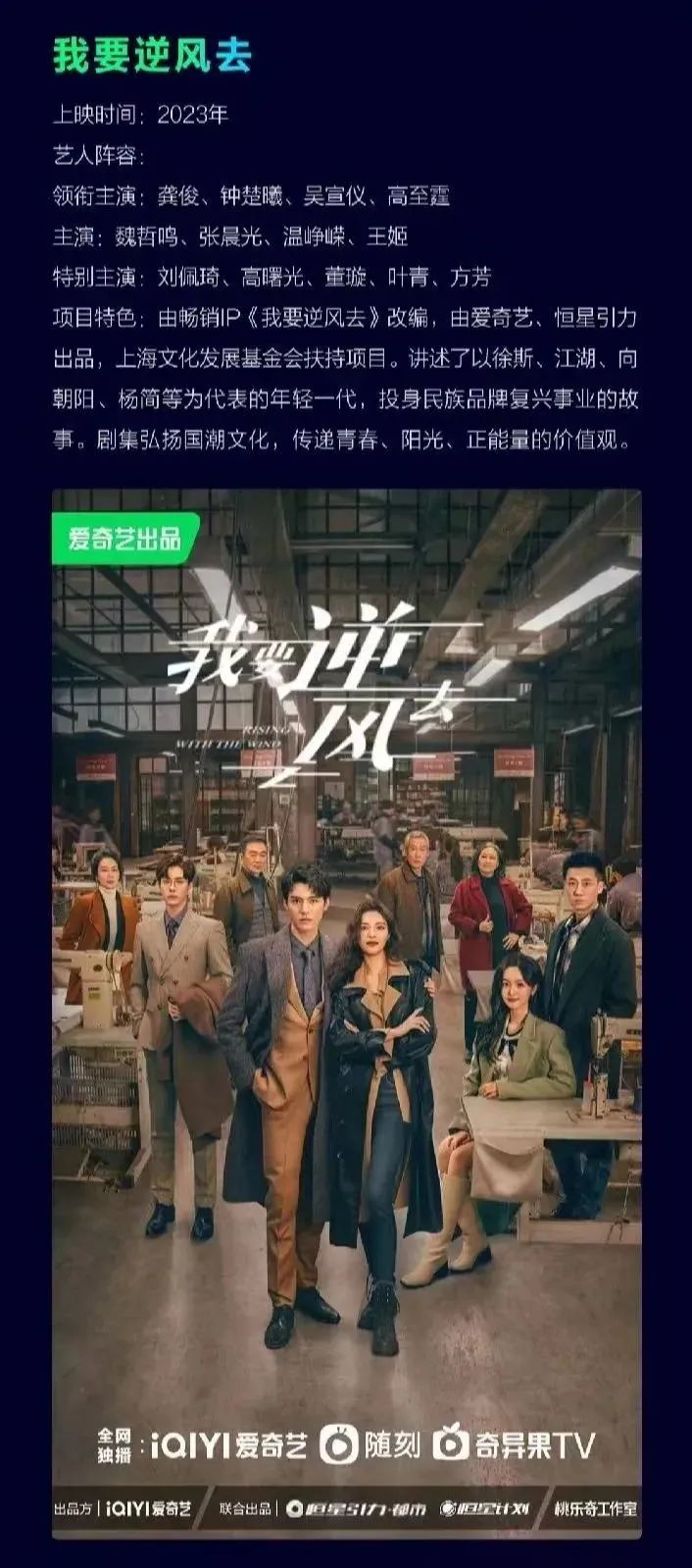 都市职场剧《我要逆风去》由爱奇艺、恒星引力出品,赵一龙执导,龚俊、钟楚曦、吴宣仪、高至霆领衔主演,在青岛西海岸新区取景拍摄。该剧改编自未再同名小说,描绘了一幅大国品牌在互联网经济浪潮中求生求变、逆风一战的壮阔图景。预计2023年播出。
