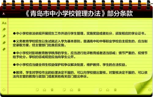 日前,青岛正式颁布了《青岛市中小学校管理办法》,从2017年3月20日起施行。这是全国第一部以学校为主体的地方性政府规章,对于青岛甚至全国都有里程碑的意义。该办法的第十一条针对学生管理提出了具体要求,“中小学校对影响教育教学秩序的学生,应当进行批评教育或者适当惩戒;情节严重的,视情节给予处分。学校的惩戒规定应当向学生公开。”