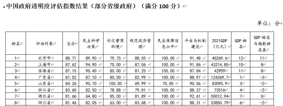 排名靠前的省级政府分别为:北京市、上海市、安徽省、广东省、山东省、浙江省、湖北省、四川省。