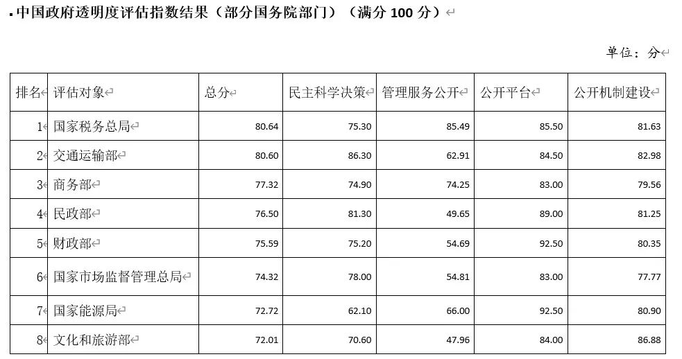 2022 年评估结果显示,国务院部门中排名靠前的分别为:国家税务总局、交通运输部、商务部、民政部、财政部、国家市场监督管理总局、国家能源局、文化和旅游部。