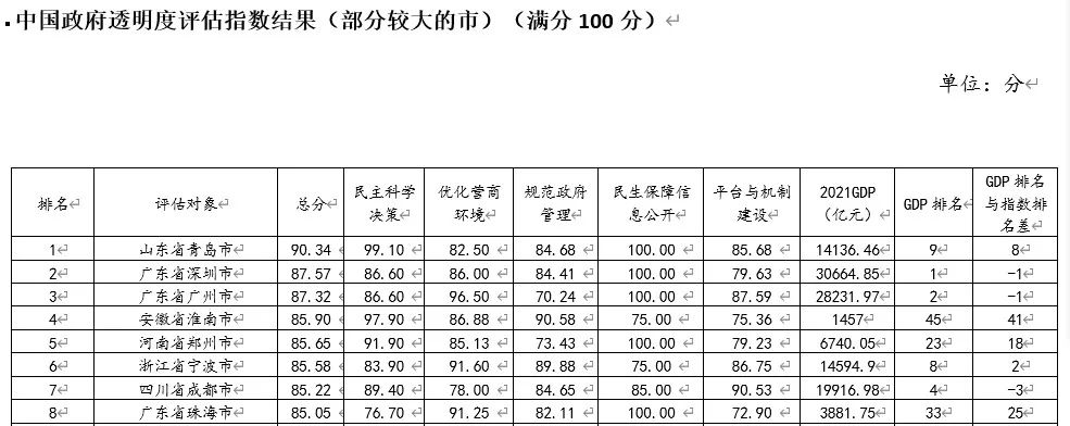 根据党和国家近年来对政务公开的新要求和新定位,结合当前政务公开在经济社会发展和政府管理中的功能与作用,5月19日,中国社科院法学研究所、社科文献出版社联合在京主办“2023年法治蓝皮书《中国法治发展报告》《四川依法治省年度报告》《珠海法治发展报告》发布暨中国法治发展研讨会”。会上发布的《中国政府透明度指数报告(2022)》评估结果显示,排名靠前的较大的市类别中,青岛领先深圳2.77分位列第一名。