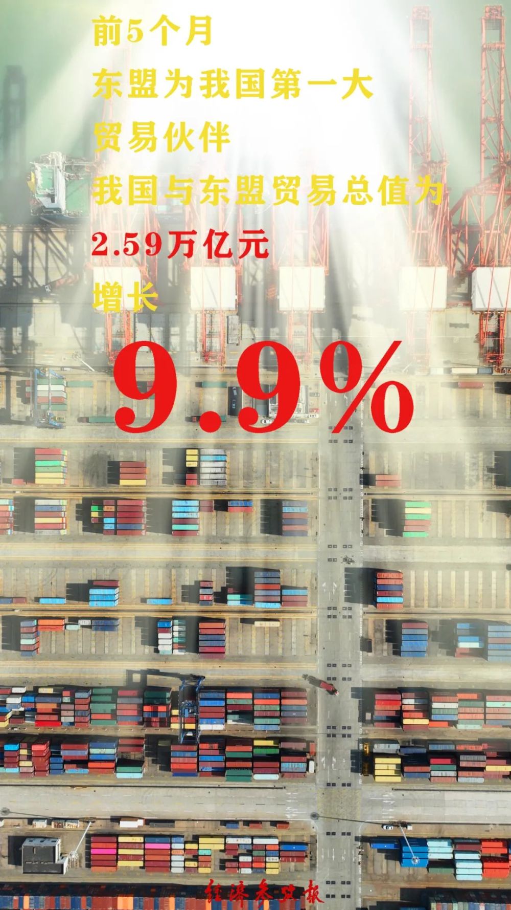前5个月,东盟为我国第一大贸易伙伴,我国与东盟贸易总值为2.59万亿元,增长9.9%,占我国外贸总值的15.4%。