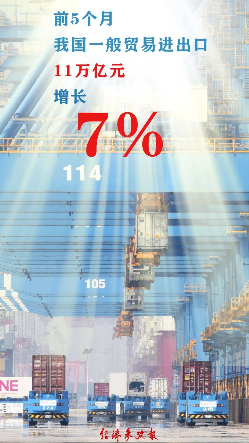 前5个月,我国一般贸易进出口11万亿元,增长7%,占我国外贸总值的65.6%,比去年同期提升1.4个百分点。