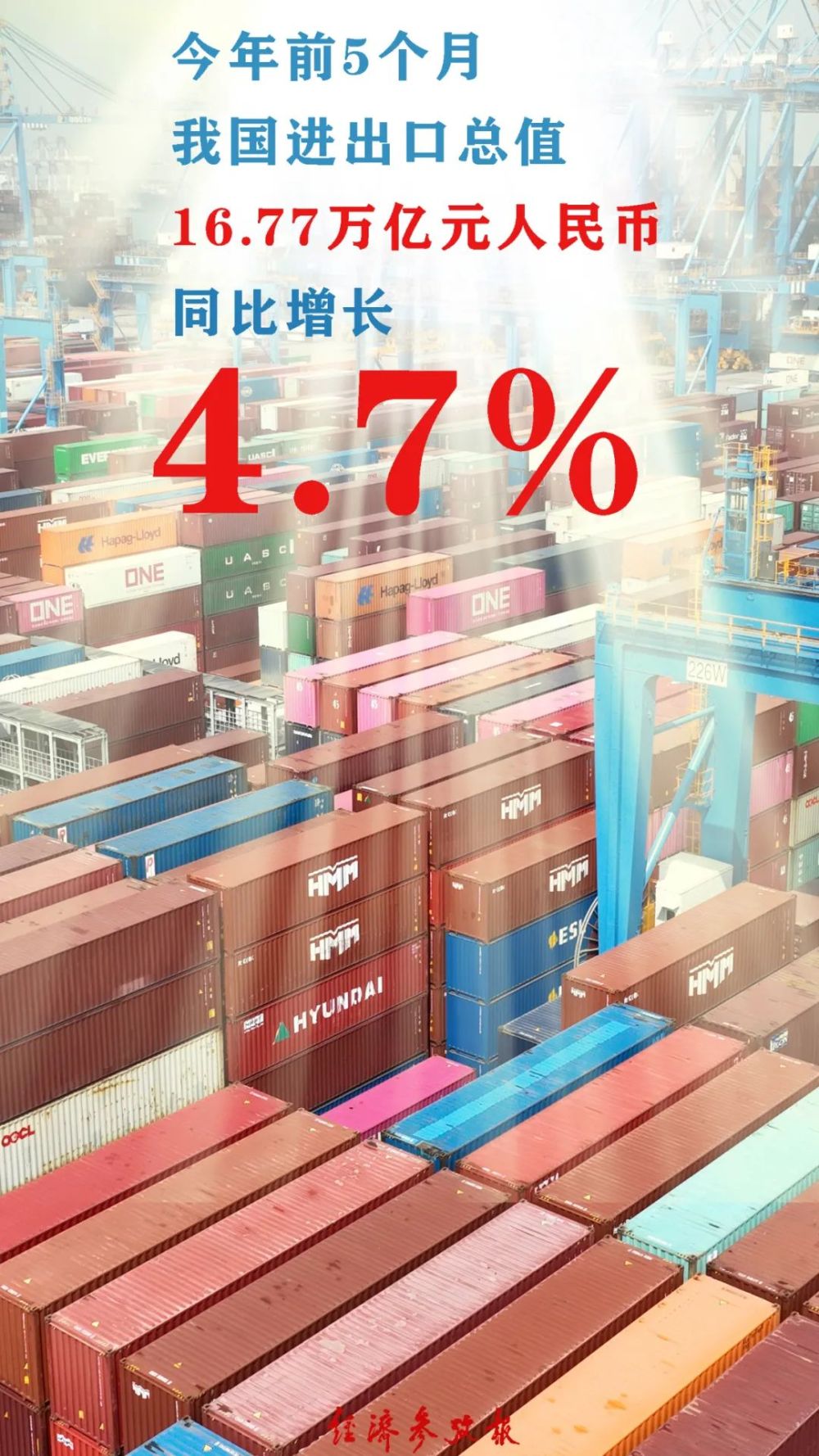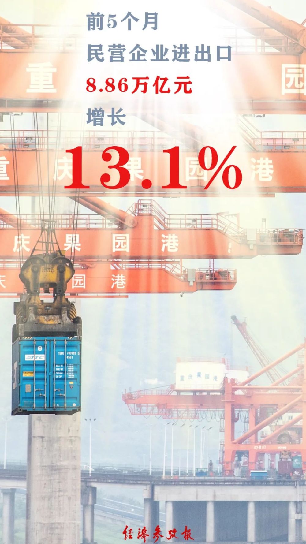 前5个月,民营企业进出口8.86万亿元,增长13.1%,占我国外贸总值的52.8%,比去年同期提升3.9个百分点。