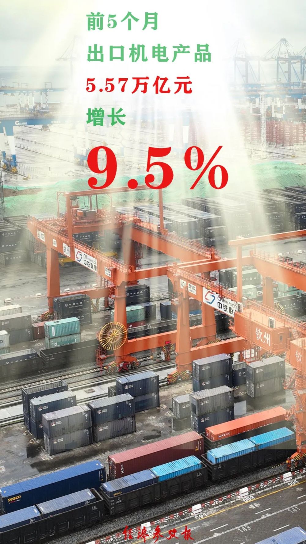 前5个月,出口机电产品5.57万亿元,增长9.5%,占出口总值的57.9%。