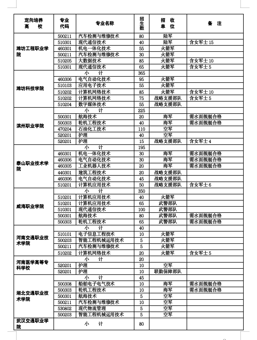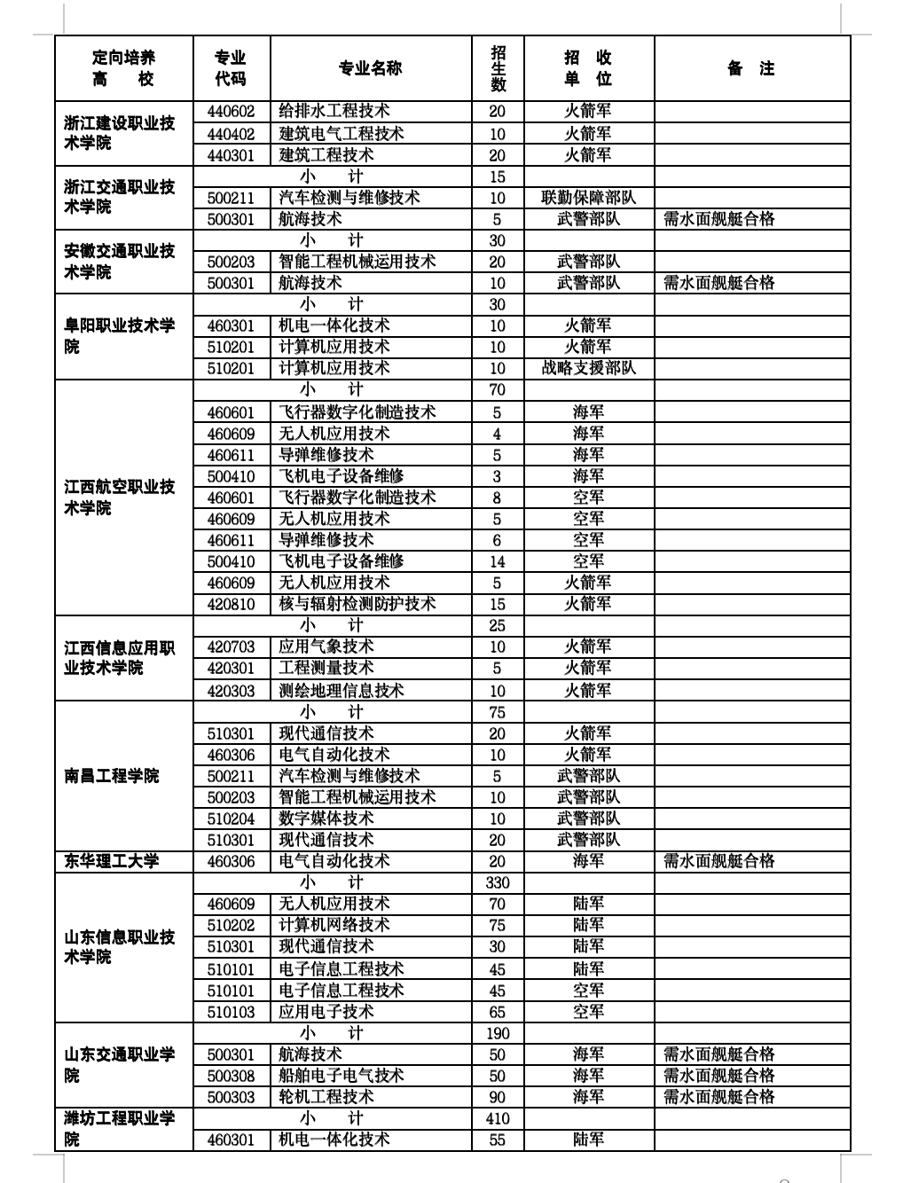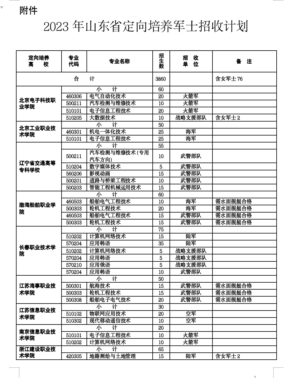日前,山东省教育招生考试院发布《关于做好2023年招收定向培养军士工作的通知》,今年我省为解放军和武警部队招收定向培养军士3860人(含女军士76人)。在我省招生的高校有北京电子科技职业学院、山东交通职业学院、泰山职业技术学院等47所。