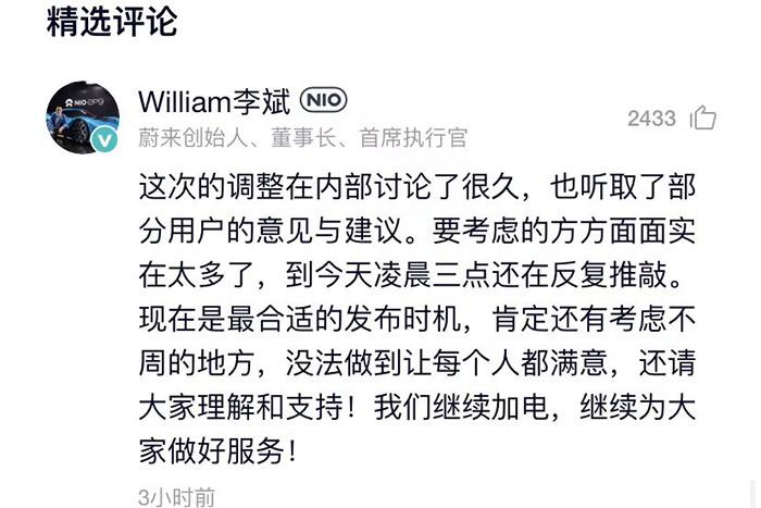 在蔚来调整全系新车的价格及首任车主用车权益后,蔚来创始人、董事长、首席执行官李斌在蔚来官方APP上回应称,“这次调整内部讨论了很久,也听取了部分用户的意见和建议。要考虑的方方面面实在是太多了,到今天三点还在反复推敲。现在是最合适的发布时机,肯定还有考虑不周的地方,没法做到每个人都满意。”