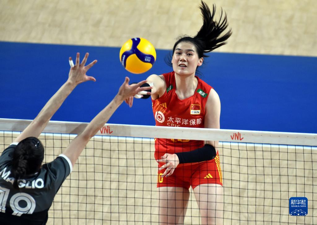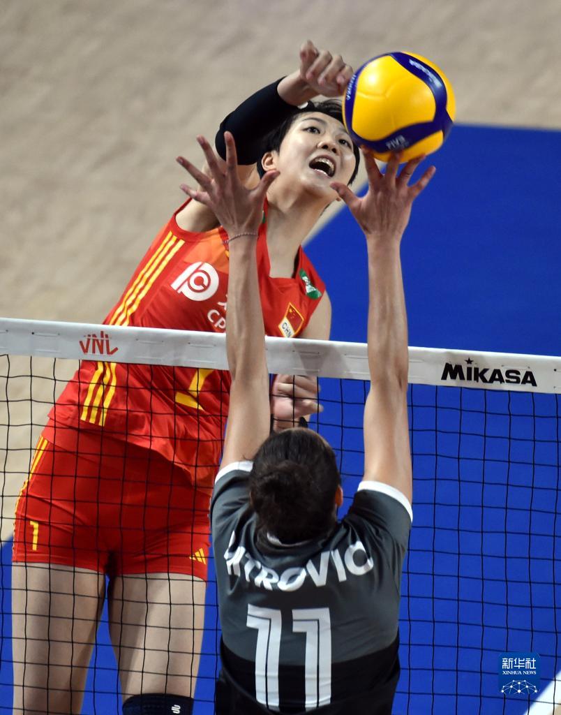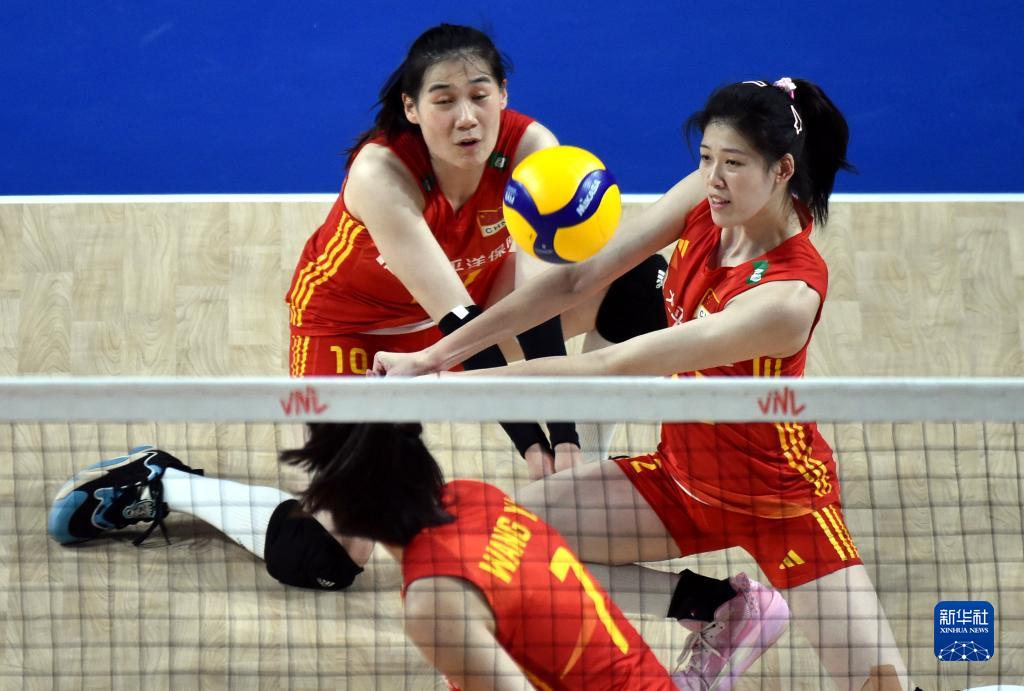 6月13日,中国队球员袁心玥(上)在比赛中扣球。新华社记者卢炳辉摄