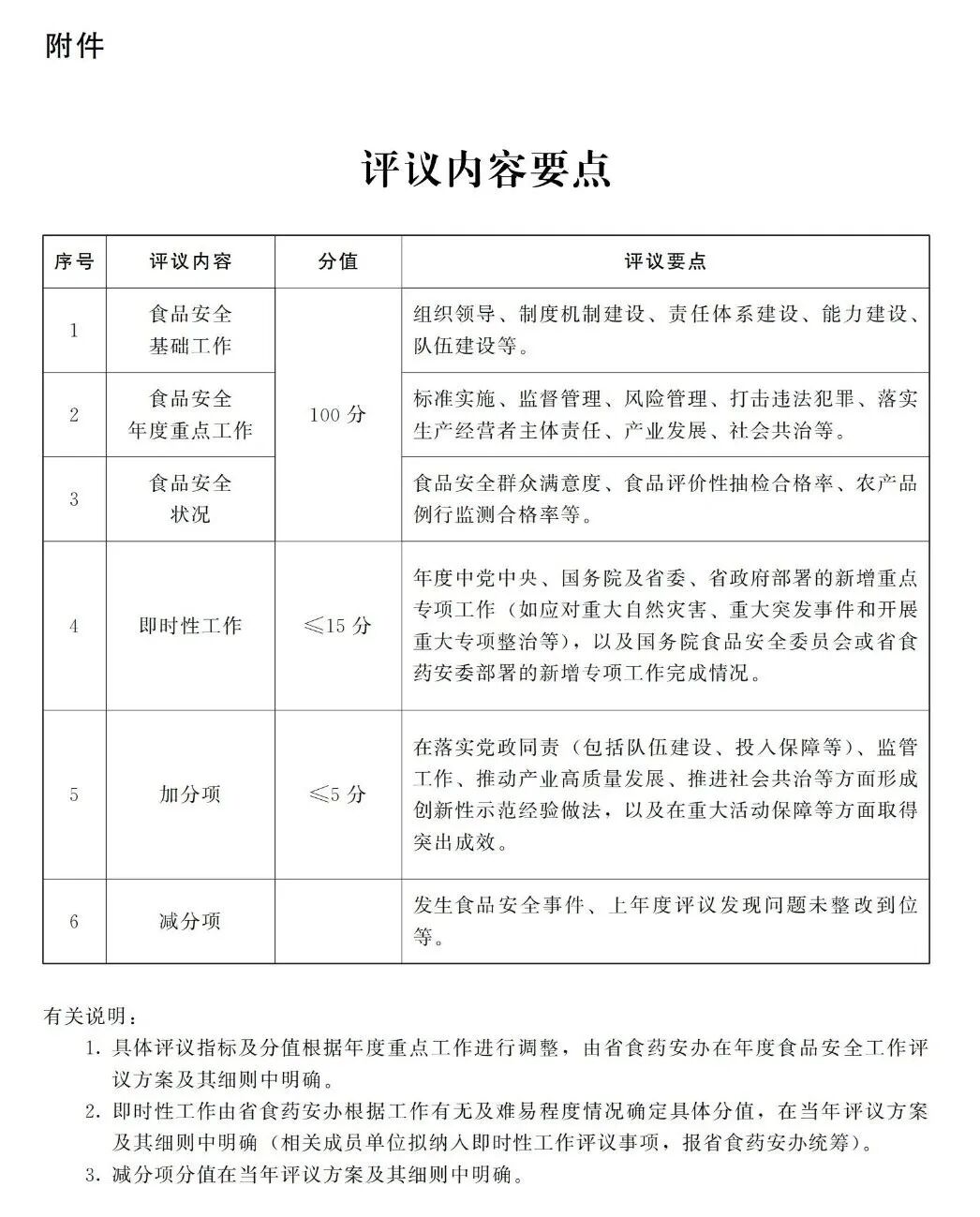 第五条 评议内容主要包括食品安全基础工作推进、年度重点工作落实、食品安全状况等,同时设置即时性工作评价和加减分项(评议内容要点见附件)。具体评议指标及分值在年度食品安全工作评议方案及其细则中明确,设置要科学合理,可操作、可评价、可区分,切实减轻基层负担。