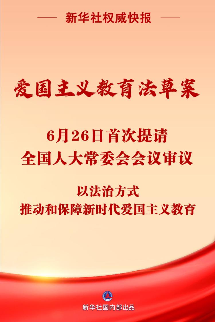 爱国主义教育法草案6月26日首次提请全国人大常委会会议审议。制定爱国主义教育法,以法治方式推动和保障新时代爱国主义教育,对于振奋民族精神、凝聚人民力量,推进强国建设、民族复兴,具有十分重大而深远的意义。