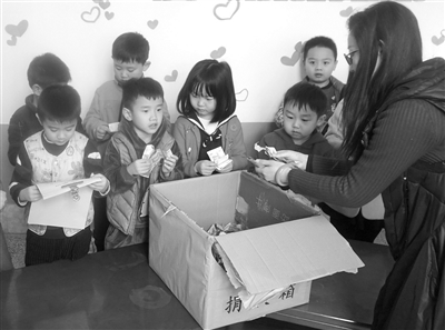 新学期伊始,山东青岛平度市实验幼儿园组织开展了“1元钱的力量”主题活动,呼吁幼儿把春节期间收到的压岁钱,捐出1元钱购买图书、衣物和学习用品送给青海玉树的幼儿园小伙伴,并给他们写一封信。本报记者 孙军 摄
