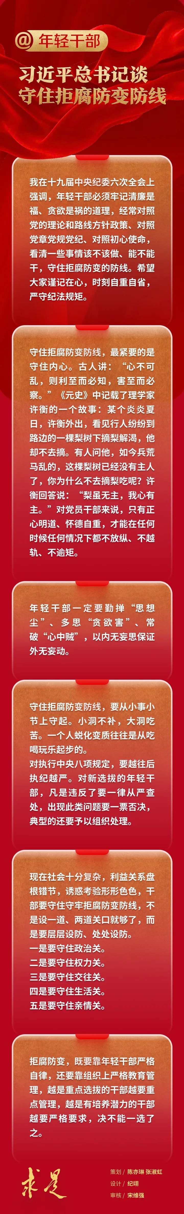 在2023年第13期《求是》杂志刊发的习近平总书记重要文章《努力成长为对党和人民忠诚可靠、堪当时代重任的栋梁之才》中,总书记强调:“年轻干部必须牢记清廉是福、贪欲是祸的道理”,“守住拒腐防变防线”。