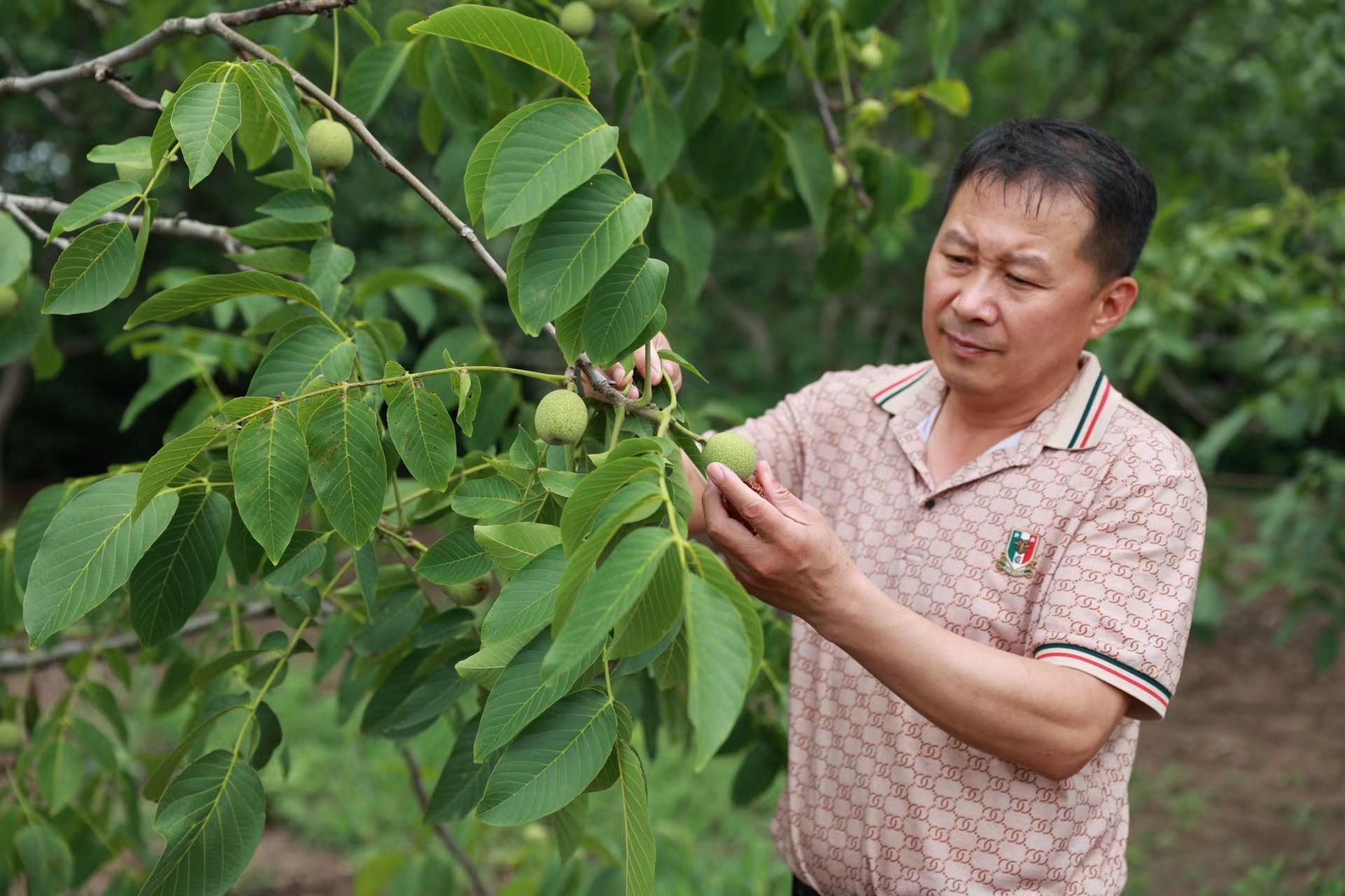 青岛吴家核桃文化产业园负责人吴占嘉正在查看核桃生长情况。