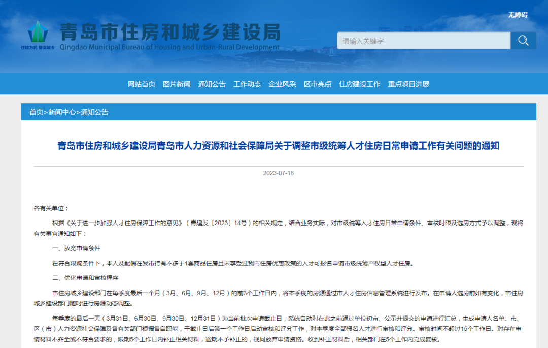 根据《关于进一步加强人才住房保障工作的意见》(青建发〔2023〕14号)的相关规定,结合业务实际,对市级统筹人才住房日常申请条件、审核时限及选房方式予以调整,现将有关事宜通知如下: