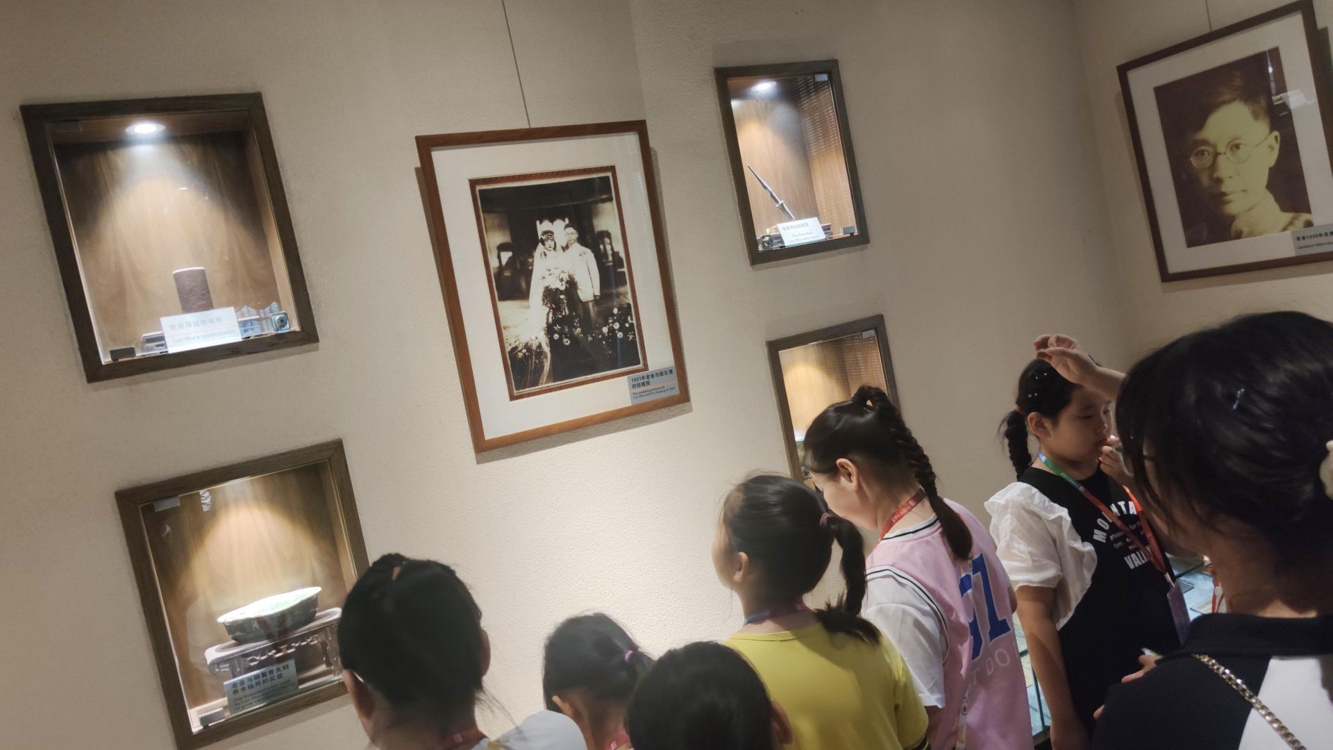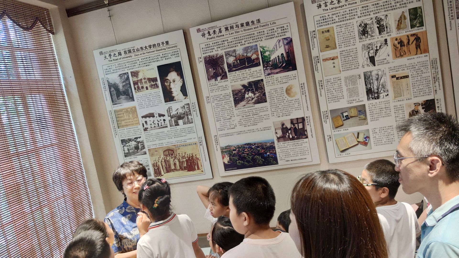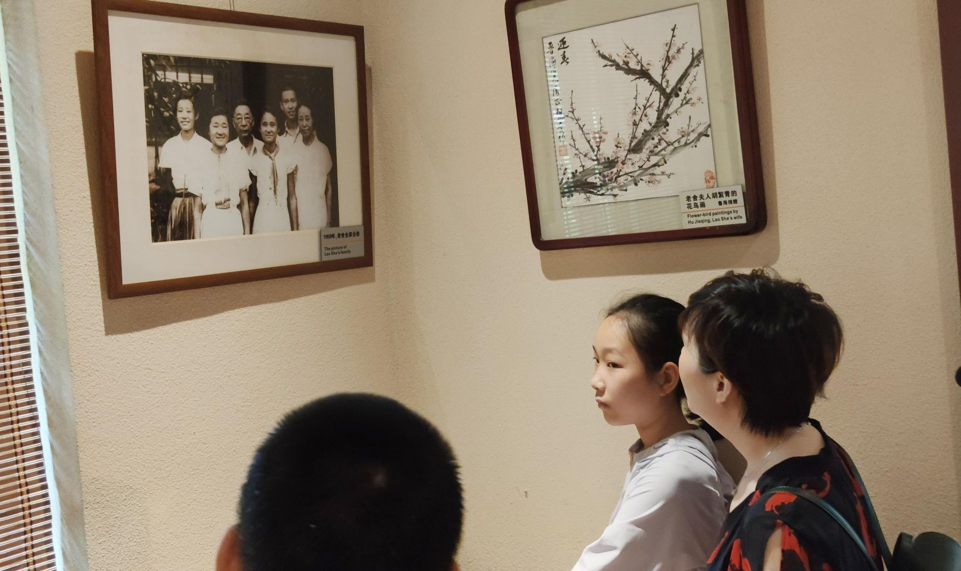 小记者观看老舍先生的全家福照片