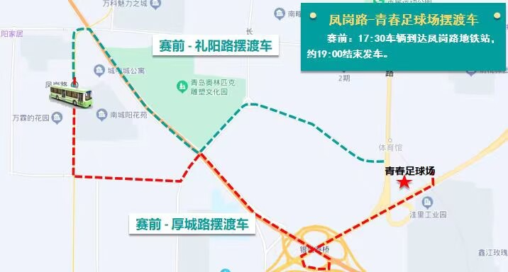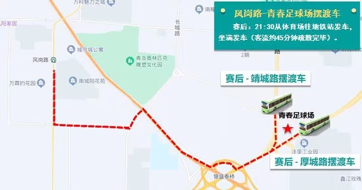 城运集团提供地铁1号线凤岗路地铁站至青春足球场之间往返摆渡车,微信搜索“海牛青春社区”小程序可购买车票,球迷可在凤岗路地铁站B口、D口出站换乘摆渡车直达青春足球