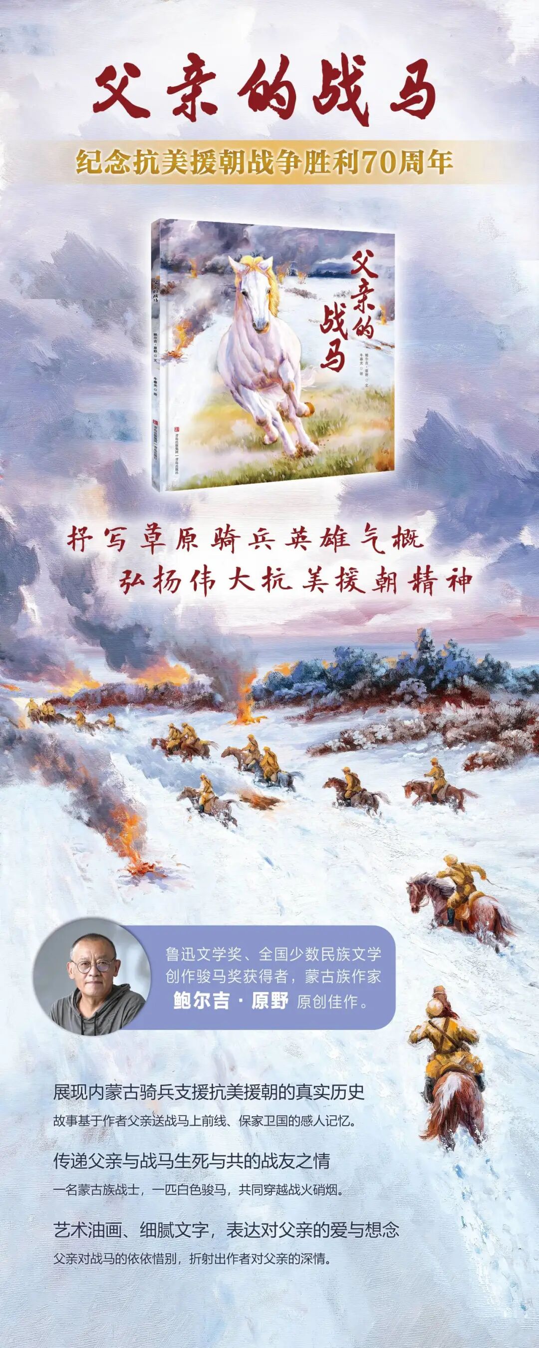 《父亲的战马》取材于本书作者、著名蒙古族作家鲍尔吉·原野先生对父亲戎马生涯的真实记忆。作为骑兵团的一员,原野的父亲参加了辽沈战役、开国大典阅兵,并在抗美援朝作战时,将自己深爱的沙日拉送给了入朝作战的志愿军战士。父亲与战马共同经历战争的残酷,见证开国大典的荣耀时刻,但在保家卫国的使命面前,又不得不永久分离。作为这一切的亲历者,即使到了晚年,他也不曾忘记那匹与他生死相依的白马。他津津乐道那些没有战争的日子里,骑兵和战马在草甸子上玩耍、游戏、休闲,也一次次感叹在危机关头,是马救了他的命。这些都被鲍尔吉·原野先生记录下来,并成为现在这本绘本的雏形。
