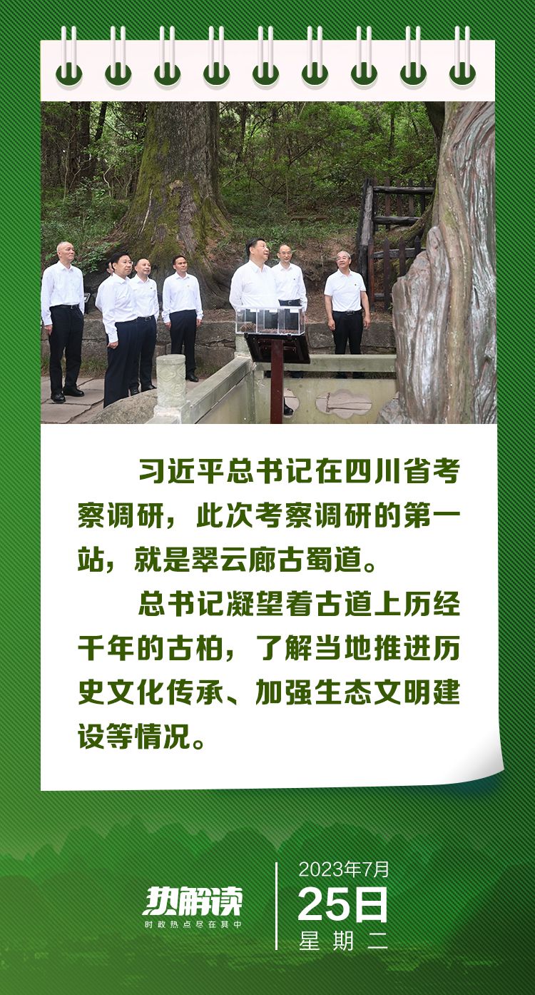 千年古柏的年轮铭刻着岁月的记忆,千年古道的青砖诉说着悠久的文明。注重文化传承发展,加强生态文明建设,是中国式现代化的题中应有之义。总书记实地踏访翠云廊古蜀道,其中蕴含着深刻的现实意义。