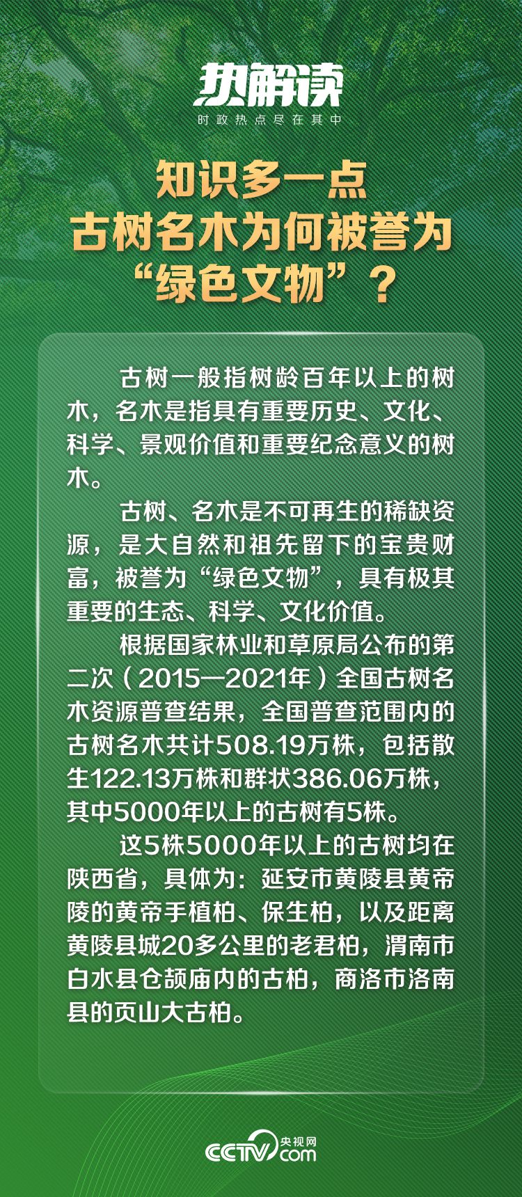 一条古蜀道,半部华夏史。千年古道上的连绵古柏,历经风雨洗礼,成为自然与人文共生的珍贵标本;而在全国各地,大批古树名木经受岁月荡涤,依然郁郁葱葱,成为中华民族富有生命力的文化遗产和历史见证。