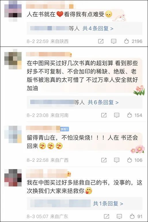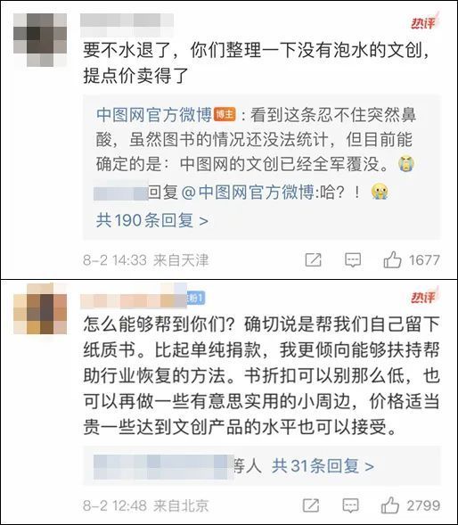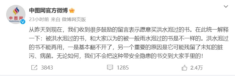对于网友们暖心的留言,中图网回应:被洪水泡过的书,和大家以为的被一般雨水泡过的书是不一样的。洪水泡过的书不能再用,一是基本翻不开了,另一个重要的原因是它可能残留了未知的脏污、病菌。无论如何,我们不会把这种带安全隐患的书交到大家手里的!