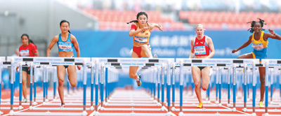 3日,中国代表团选手吴艳妮(中)在田径女子100米栏比赛中。环球时报记者 崔 萌摄