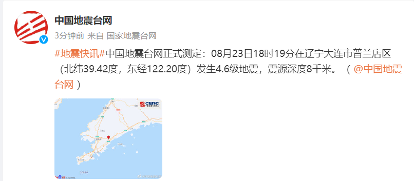 辽宁大连市普兰店区发生4.6级地震 2023-08-23 19:01 0 中国地震台网正式测定:08月23日18时19分在辽宁大连市普兰店区(北纬39.42度,东经122.20度)发生4.6级地震,震源深度8千米。 微博截图 来源:中国地震台网微博 责任编辑:林红
