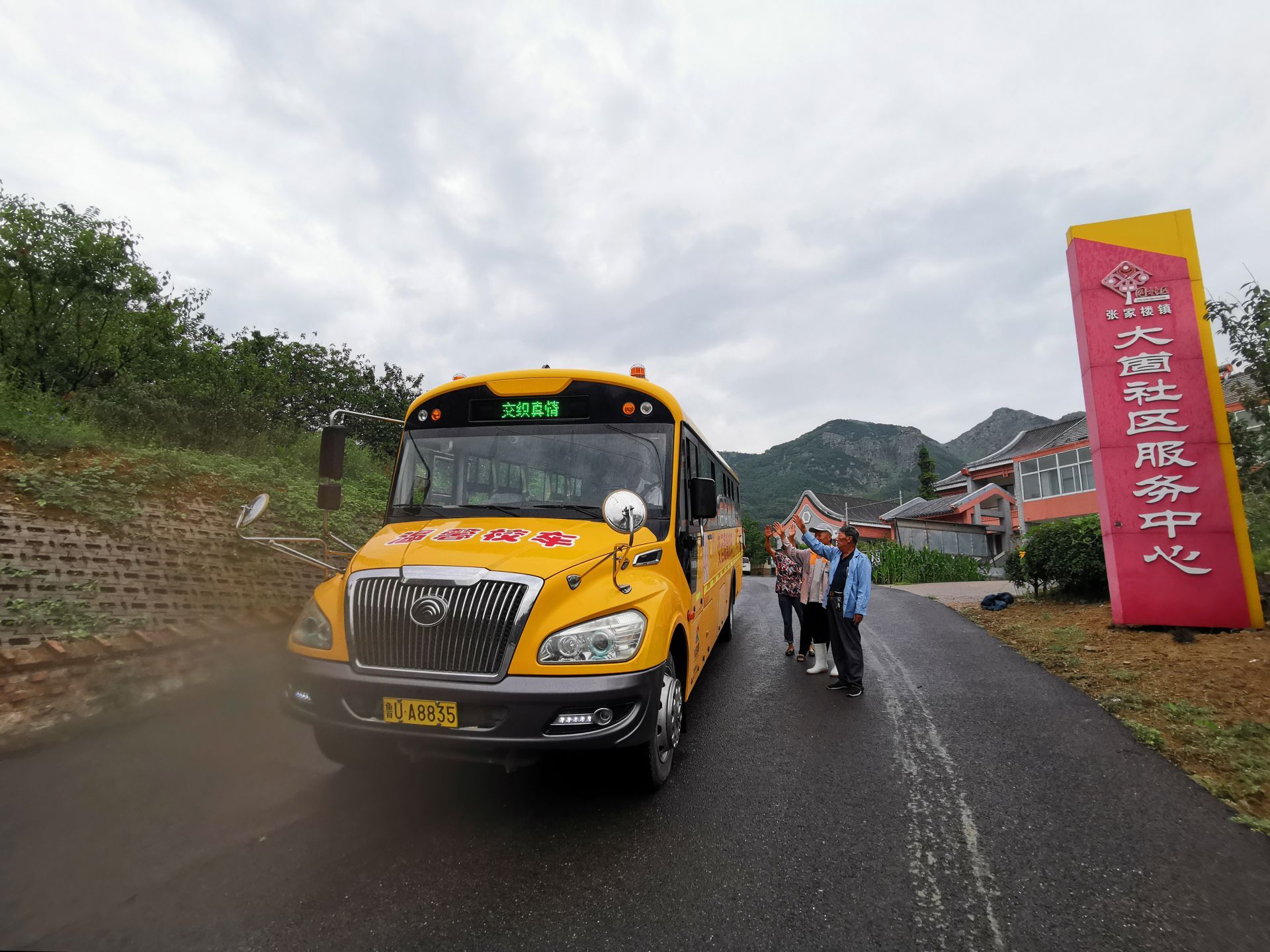 大崮社区的家长目送孩子坐校车上学