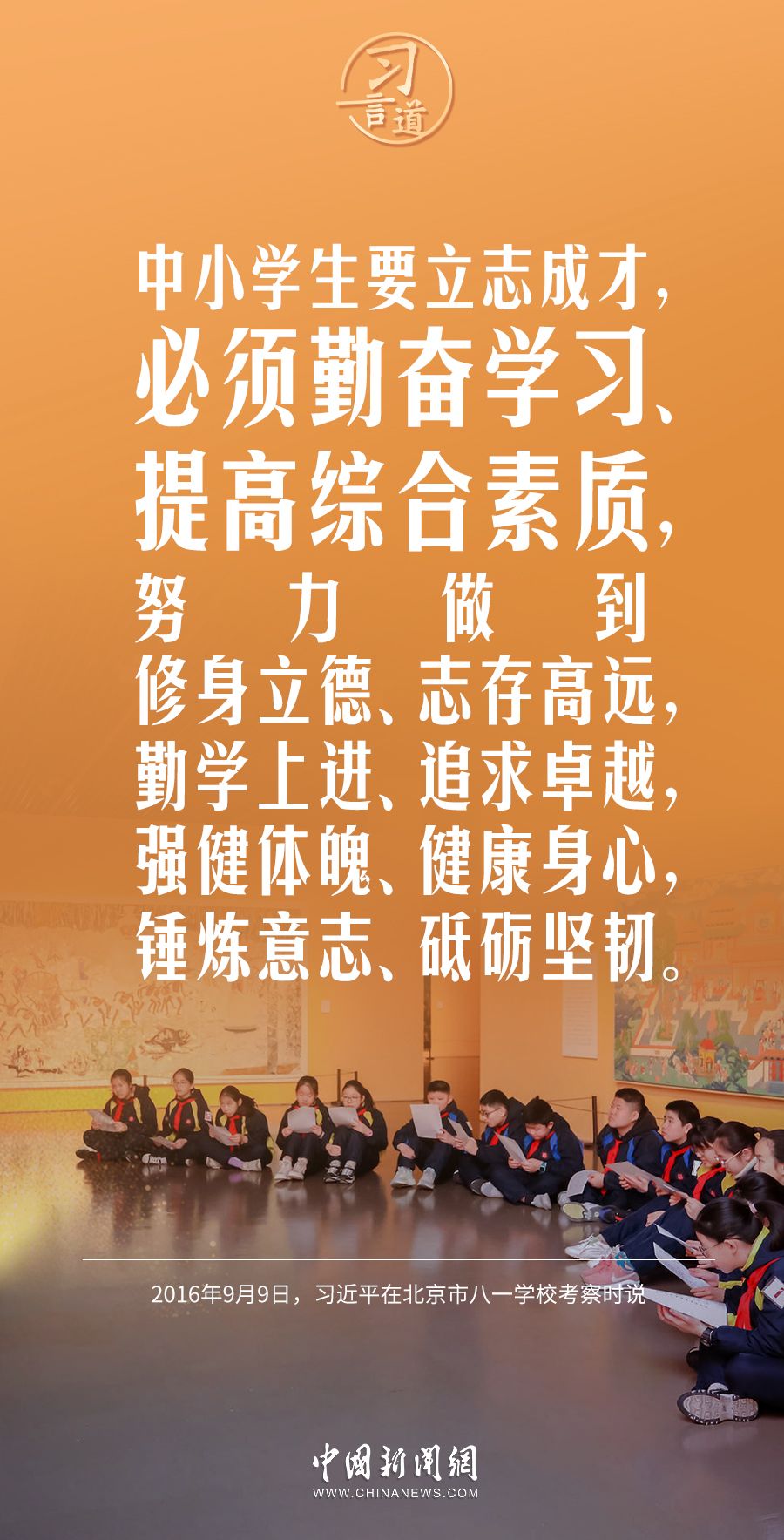 【开学第一课】习言道|立大志、明大德、成大才、担大任 2023-08-29 12:14 0 少年强、青年强则中国强。习近平总书记在多个场合寄语少年、青年们,要立鸿鹄志、做奋斗者。 来源:中国新闻网 责任编辑:崔现香