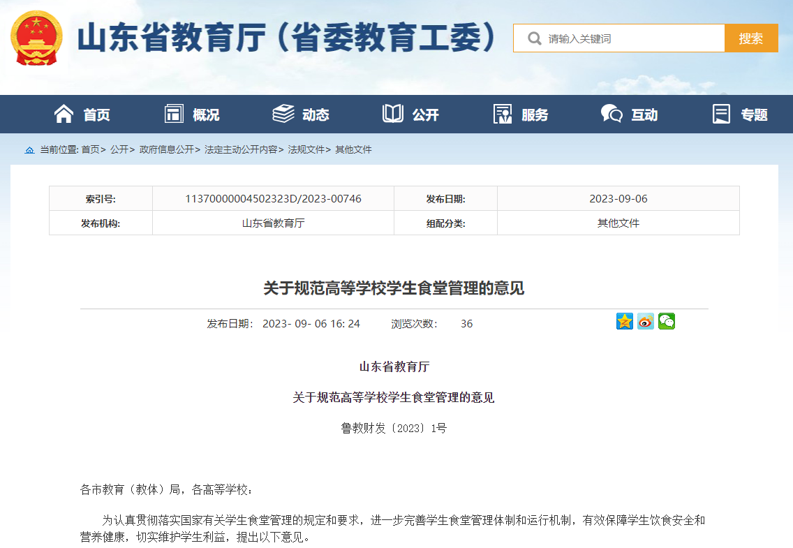 近日,山东省教育厅印发关于规范高等学校学生食堂管理的意见,进一步完善学生食堂管理体制和运行机制,有效保障学生饮食安全和营养健康,切实维护学生利益。