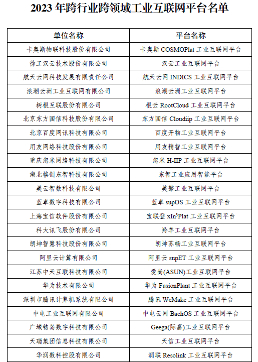 按照《工业和信息化部办公厅关于组织申报2023年跨行业跨领域工业互联网平台的通知》(工信厅信发函〔2023〕125号)要求,经推荐申报、核查评审、网上公示等环节,确定了2023年跨行业跨领域工业互联网平台名单(见附件),现予公布。请各地结合实际,加强对相关平台的服务指导,不断推动工业互联网平台创新发展。