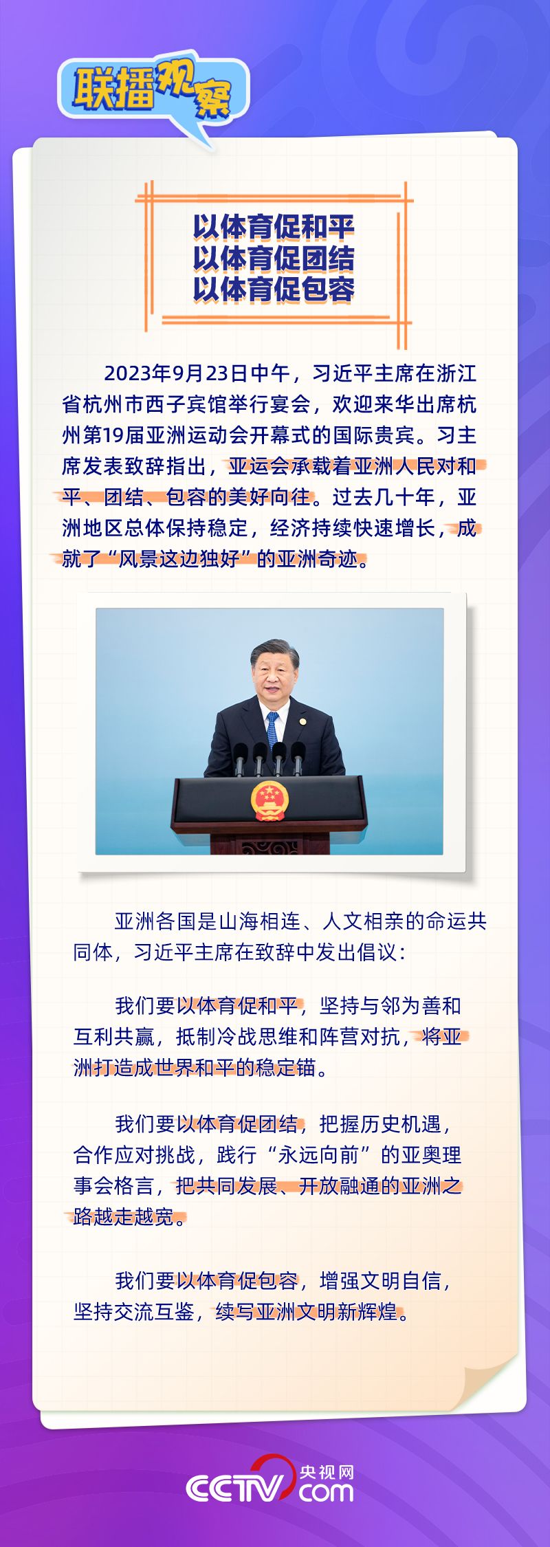 联播+9月23日,习近平主席在欢迎来华出席杭州第19届亚洲运动会开幕式的国际贵宾午宴上祝愿大家“在诗画浙江度过难忘的时光,在亚运会圣火下留下美好的记忆”。