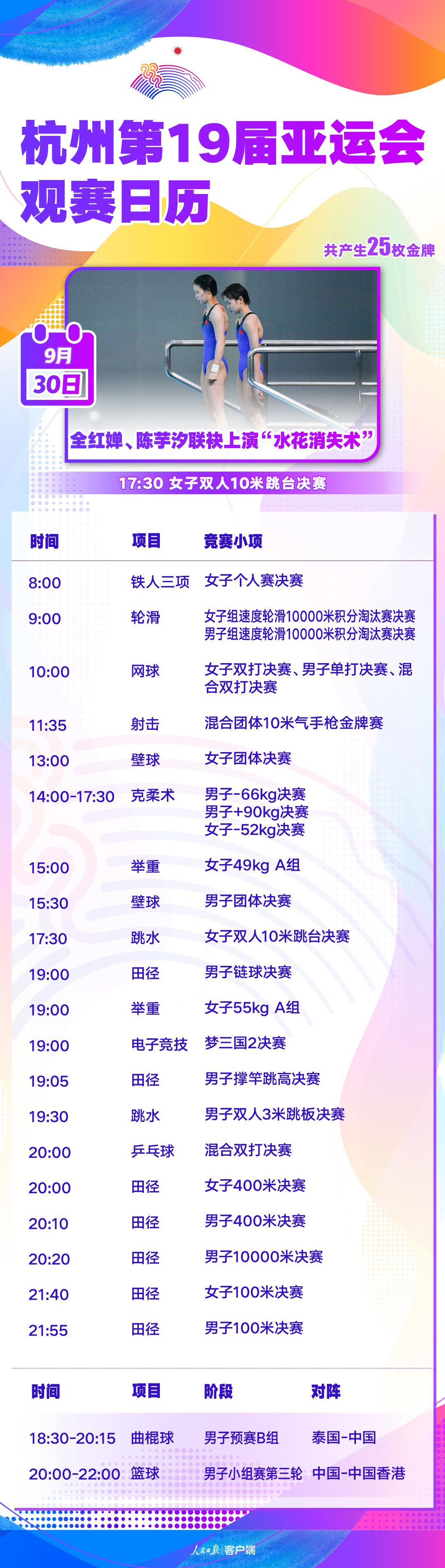 9月30日,杭州第19届亚运会赛场将产生金牌25枚。备受关注的中国跳水“梦之队”亮相,全红婵/陈芋汐将在女子双人10米跳台联手上演“水花消失术”, 严思宇/何超出战男子双人3米跳板。田径赛场第2个比赛日,百米“飞人”大战打响。此外,乒乓球混合双打决赛中国队提前锁定金牌,中国举重队登场,气手枪混合团体金牌赛姜冉馨、张博文携手出场,这些看点,值得关注。