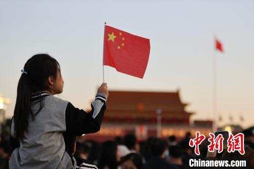 10月1日清晨,隆重的升国旗仪式在北京天安门广场举行,30.2万名民众齐聚天安门广场,共同见证五星红旗冉冉升起的庄严时刻,庆祝新中国74周年华诞。图为小朋友手持国旗在广场拍照。 中新社记者 盛佳鹏 摄