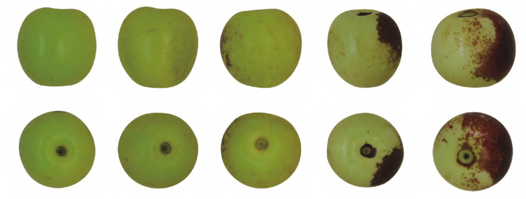 ▲从左至右依次为绿熟期、白熟期、点红期、1/3 红期、半红期的果实