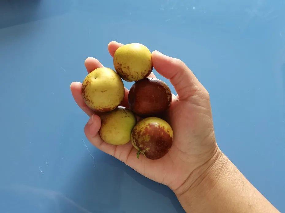 也就是说,最开始的枣都是绿色的,等鲜枣完全成熟了以后表皮就变成红色的啦。即便采摘的时候没有全部变红,在后期贮藏过程中也会逐渐变红。全红的鲜枣干制后,就是我们看到的红枣。