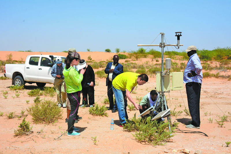 当地时间2019年3月5日,中国科学院新疆生态与地理研究所防沙治沙团队工作人员在毛里塔尼亚架设自动气象站。