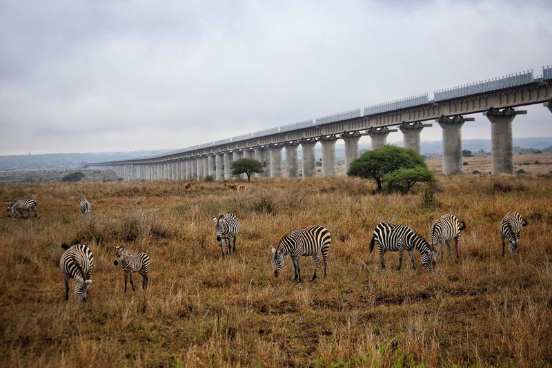 当地时间2018年12月5日,肯尼亚内罗毕,蒙内铁路穿过内罗毕国家公园采用全高架方式,保证野生动物可以安全穿过铁路。