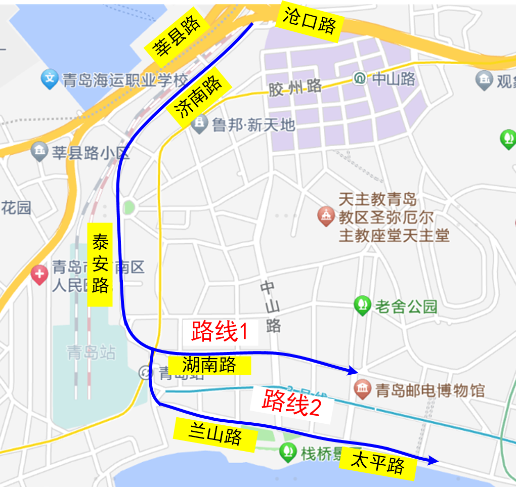 由晓港名城及莘县路、堂邑路、沧口路等市北区域,北向南前往前海一线(含湖南路、江苏路区域)车辆,建议通过以下道路通行:
