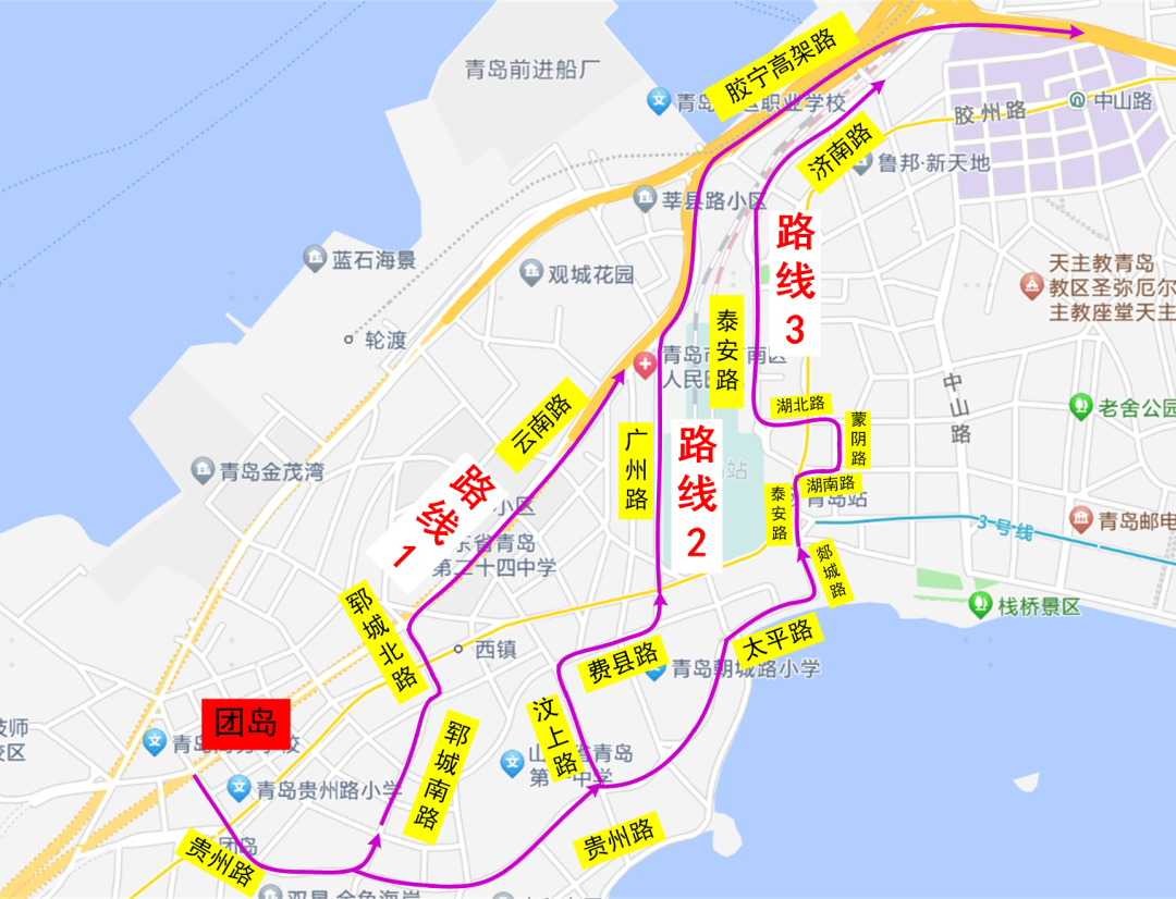 2.贵州路-汶上路-费县路-广州路-云南路-胶宁高架路;