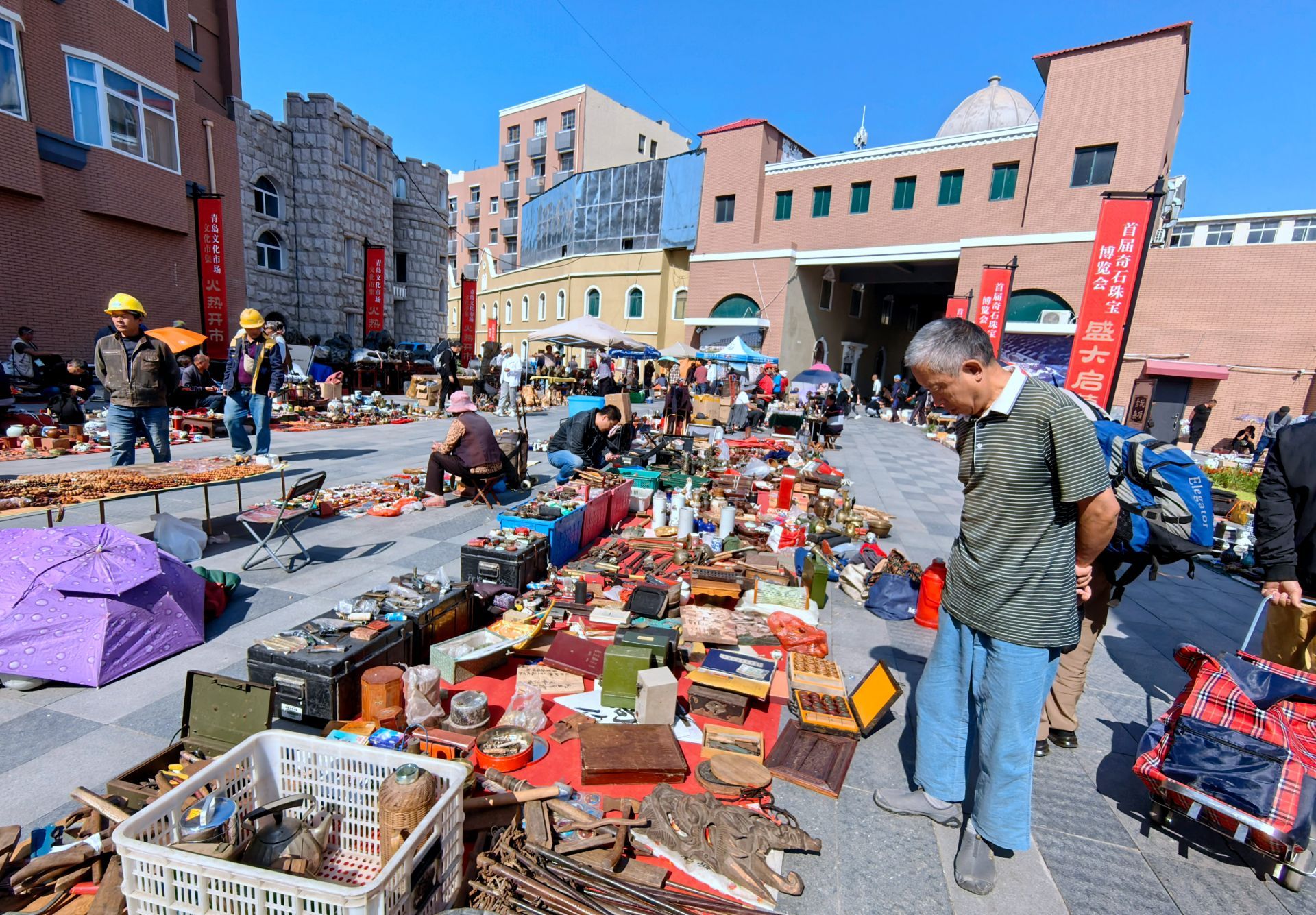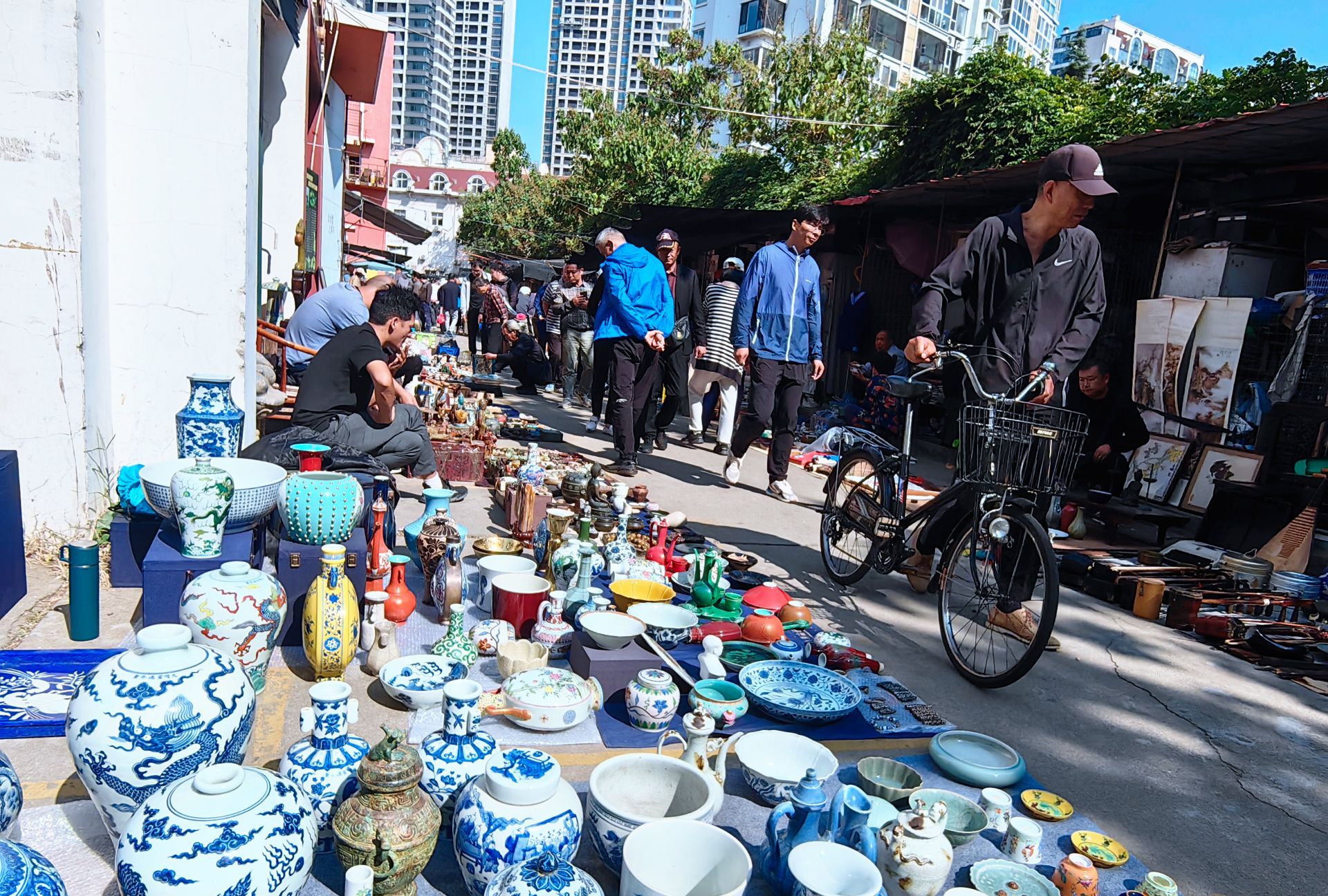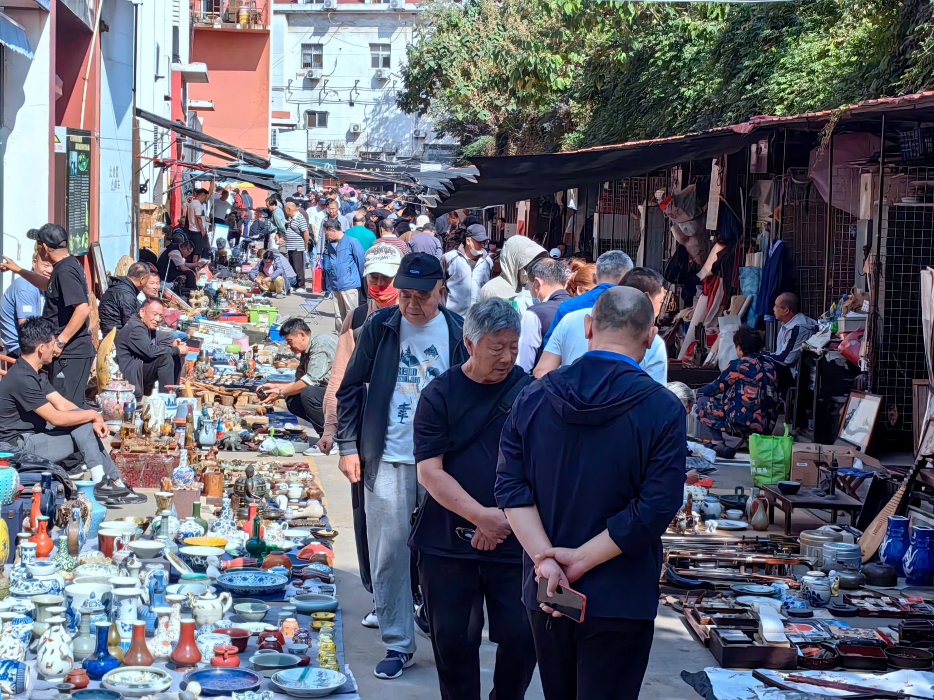 在这两个半天里,从利津路、辽宁路交界开始,一直到华阳路,再到文化市场里面,两侧的摊位上摆满了邮币卡、古玩字画、古旧书籍、文玩摆件、手珠手链、真假难辨的古董、老式物件等等,琳琅满目,令人目不暇接。