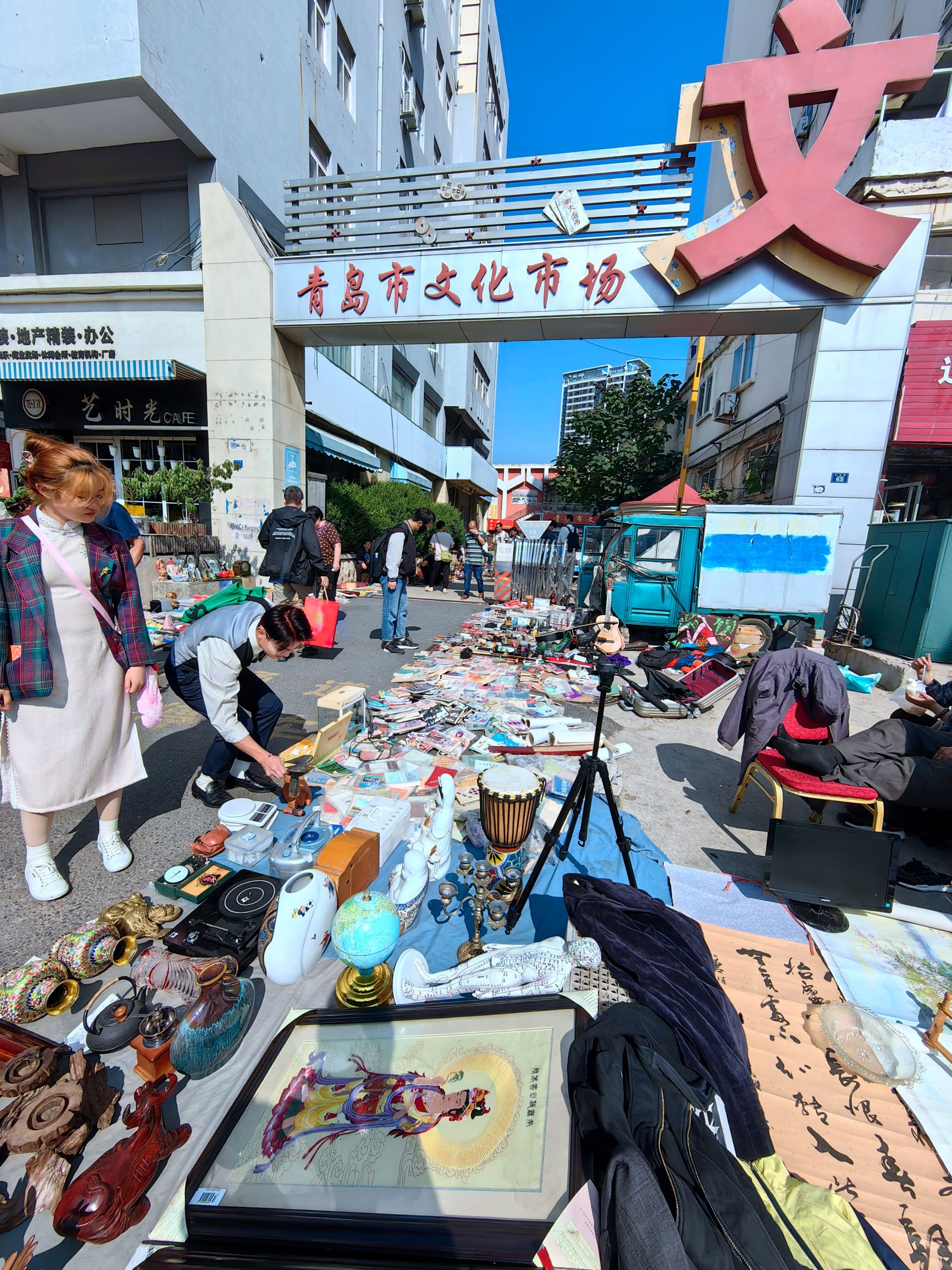 这里还售卖着一些意料之外的东西,比如珍藏多年的红酒古画小人书、很久之前的冰箱相机游戏机。作为青岛的“小潘家园”,这里收集了每个朝代的器具,城市的各个角落的物件,以及每个人的回忆。文化的磁场吸引着人们从各个地方赶来,有收藏家来捡漏的,有寻找小时物件的,有不抱目的来闲逛的,通常是人挤人般的热闹。