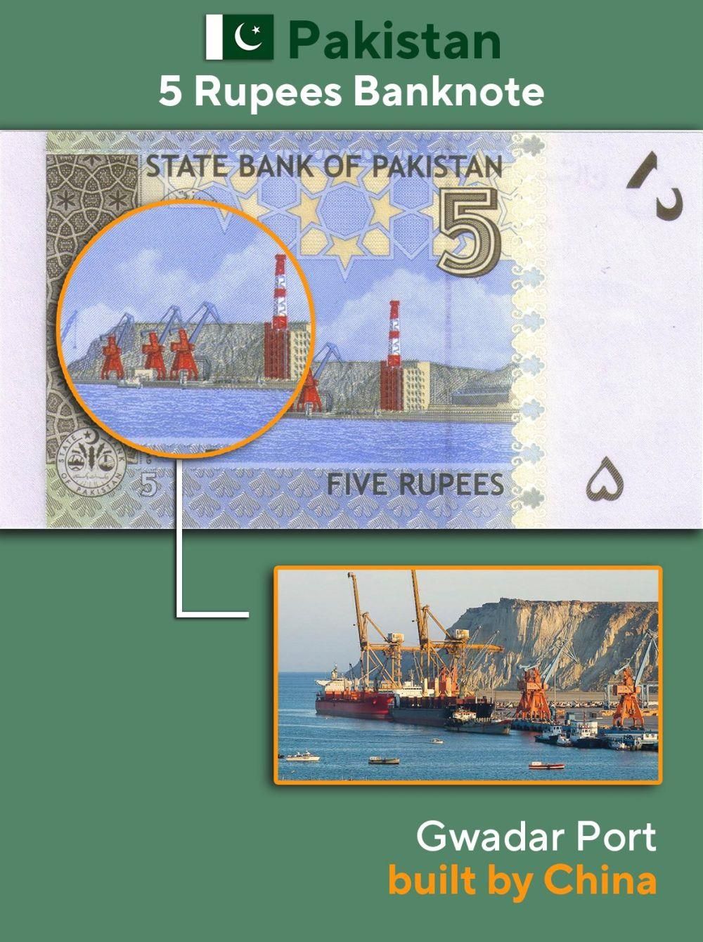 △瓜达尔港被印在巴基斯坦面额5卢比纸币上。